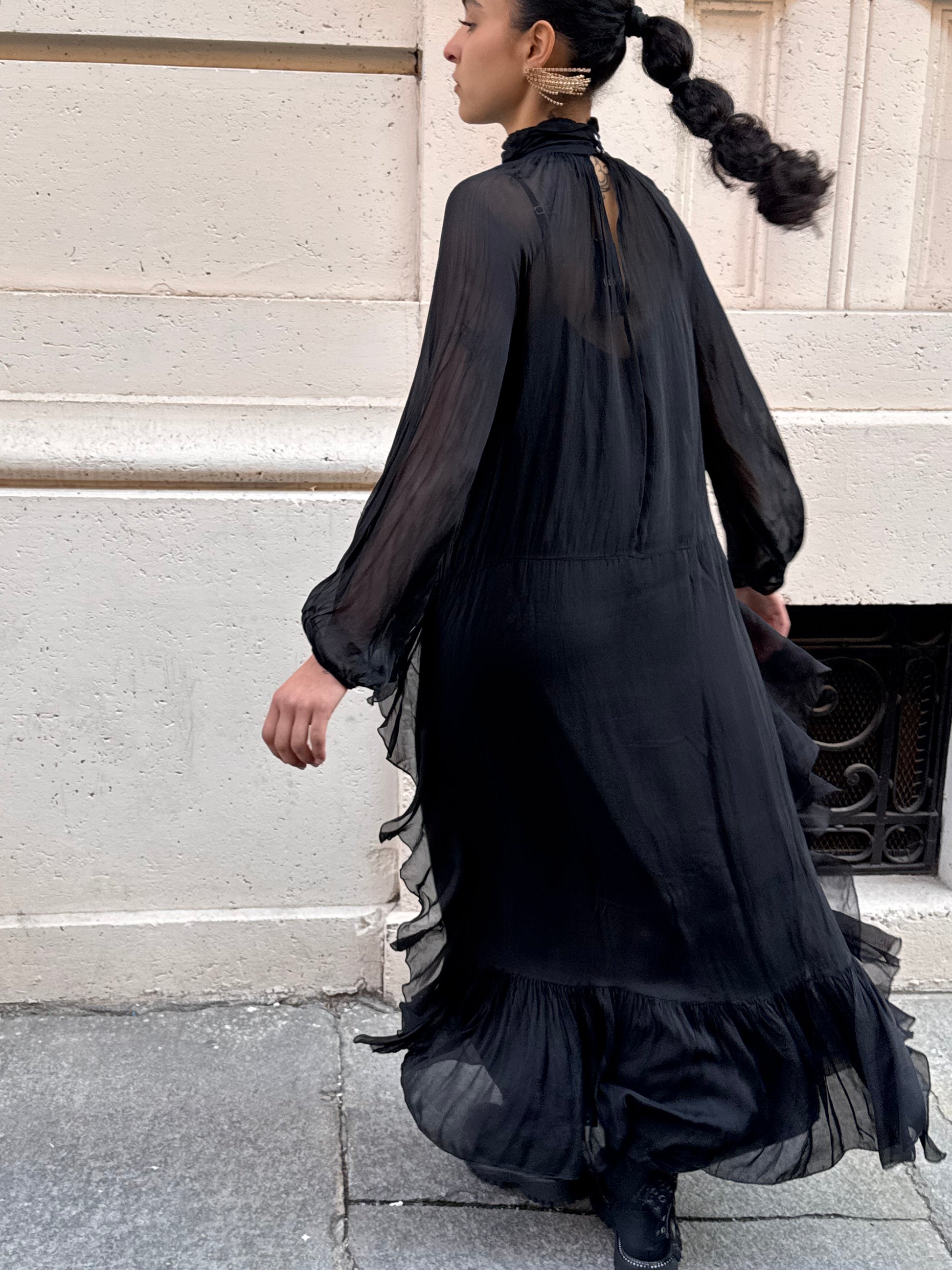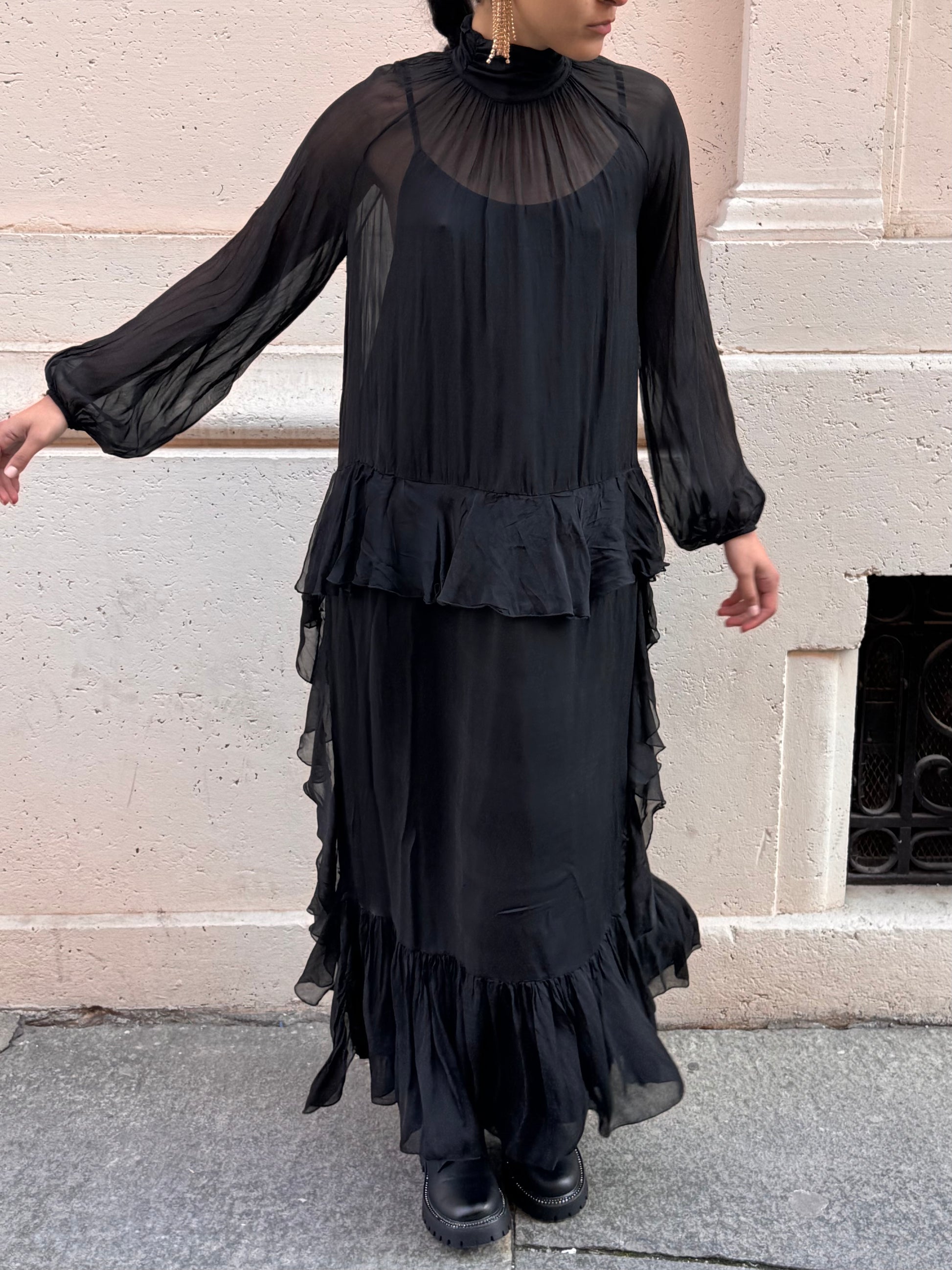 Abito lungo in chiffon con sottoveste in coordinato, manica lunga e collo alto con chiusura a due bottoni dietro. Motivo di balze dalla vita al fondo.