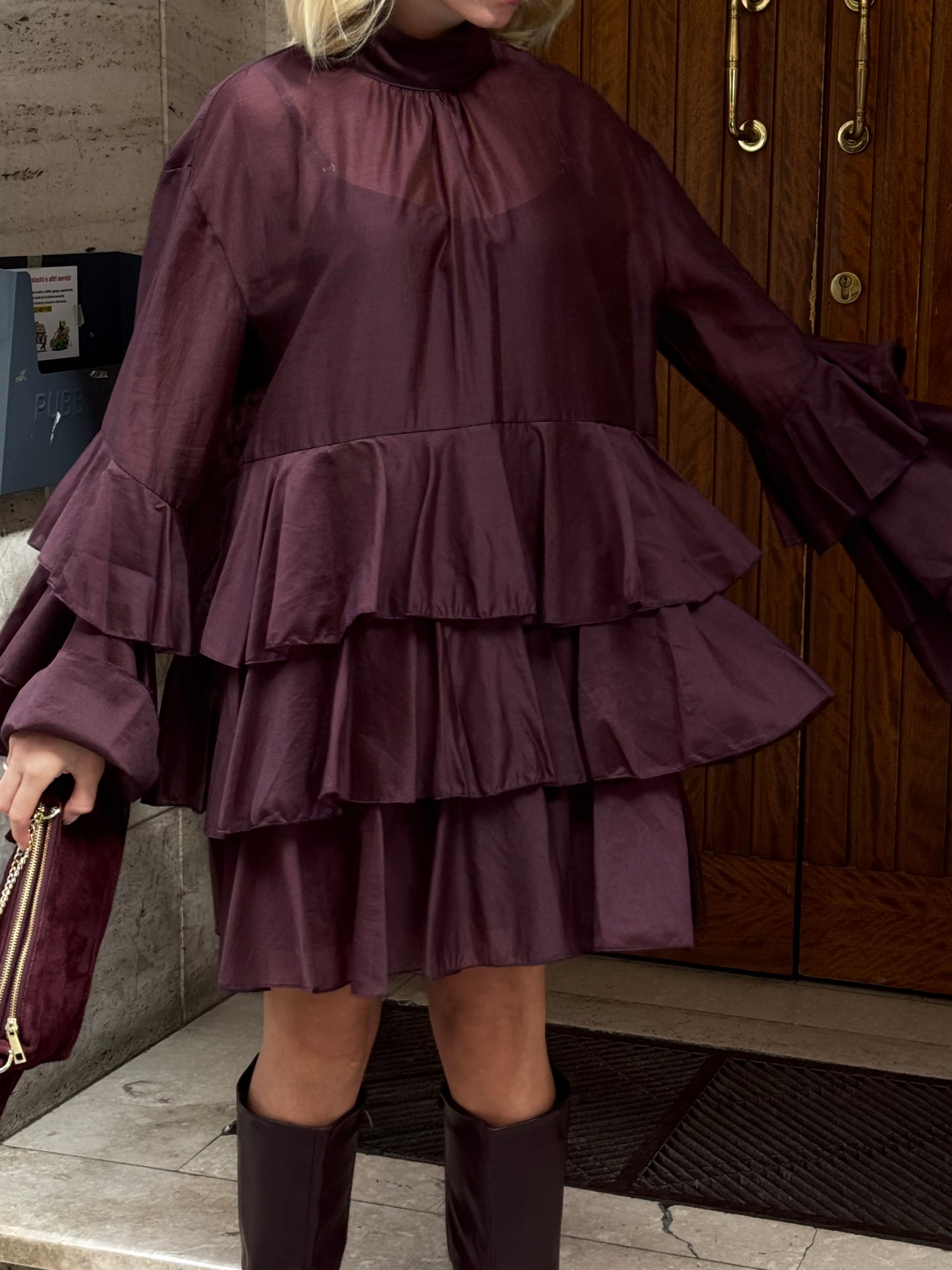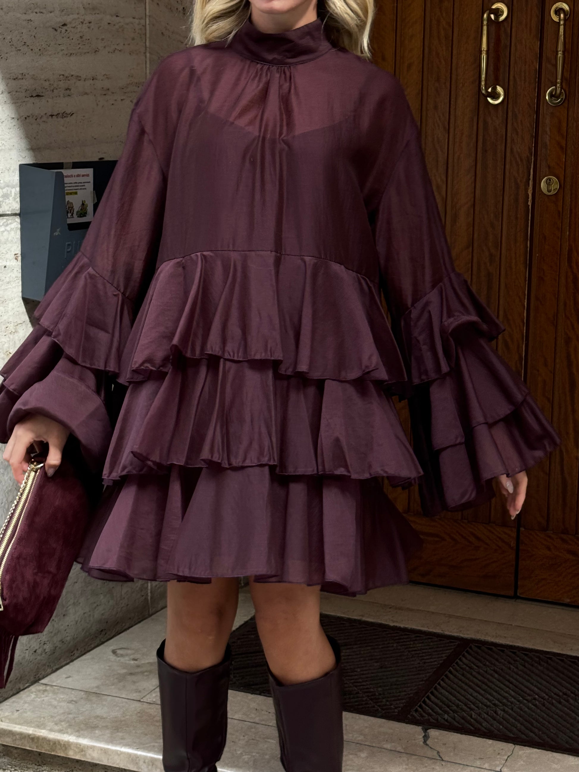 Abito a balze con manica lunga sempre con dettaglio balze. Collo a lupetto con chiusura a due bottoni dietro il collo. Ha la sottoveste in coordinato.