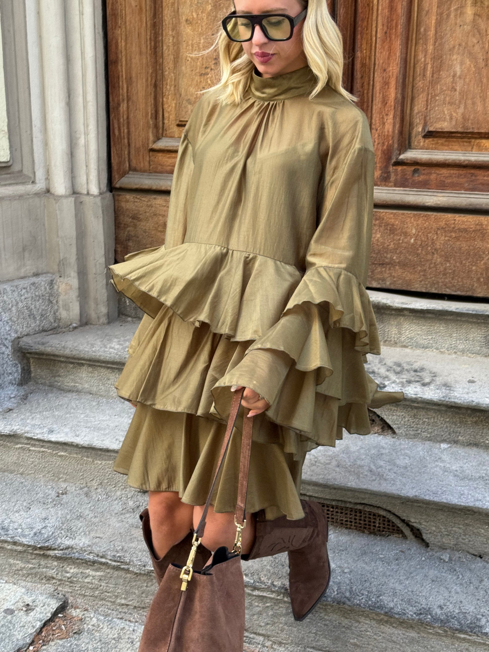 Abito a balze con manica lunga sempre con dettaglio balze. Collo a lupetto con chiusura a due bottoni dietro il collo. Ha la sottoveste in coordinato.