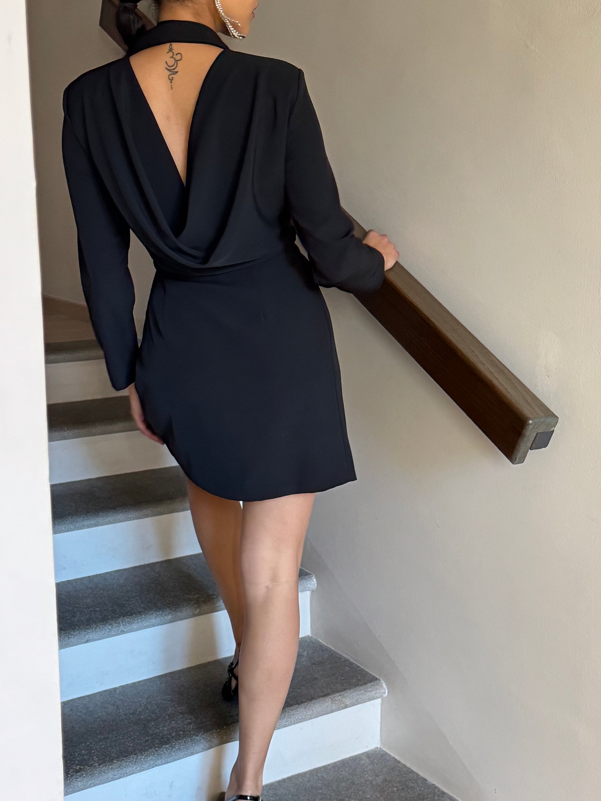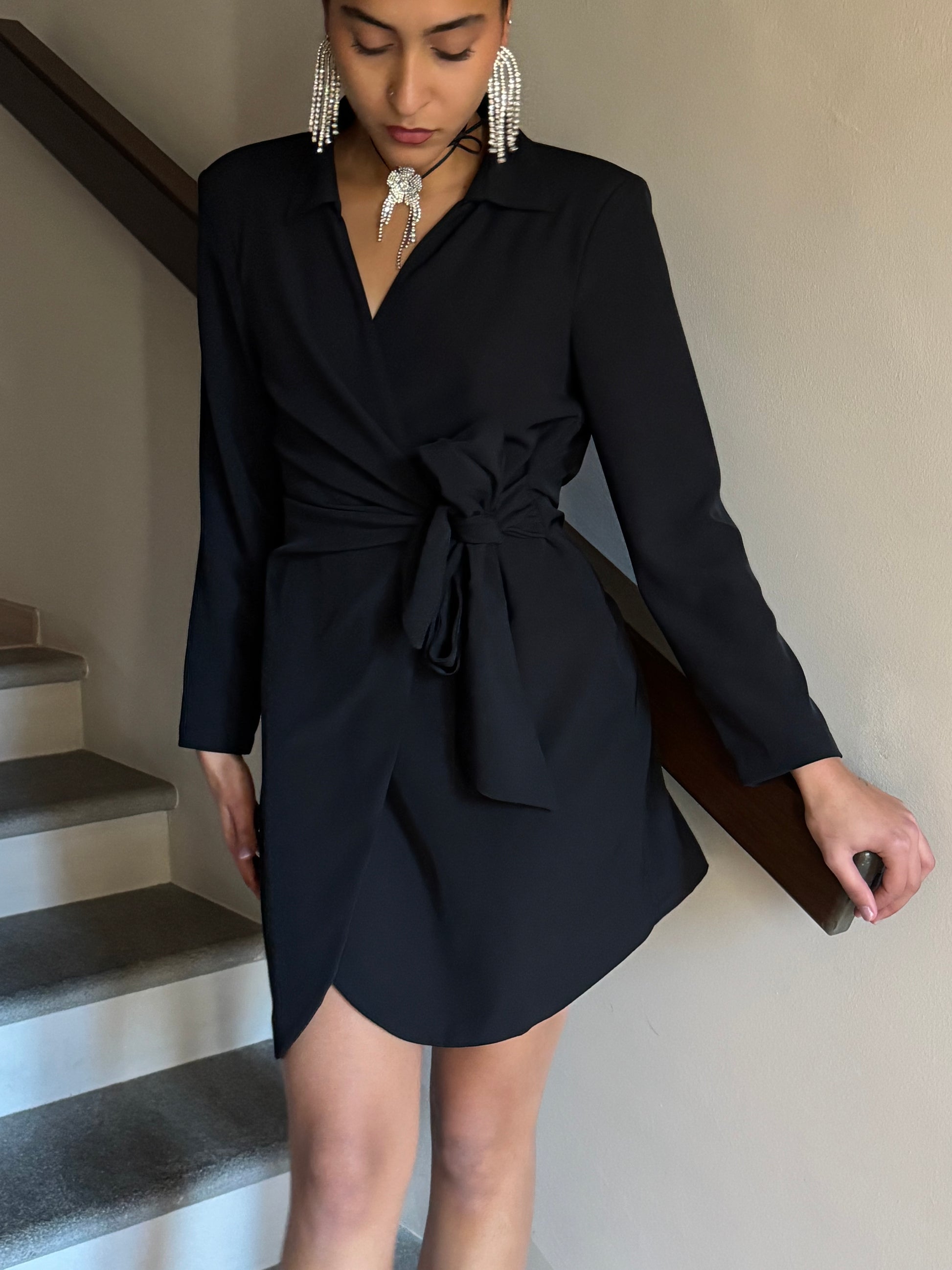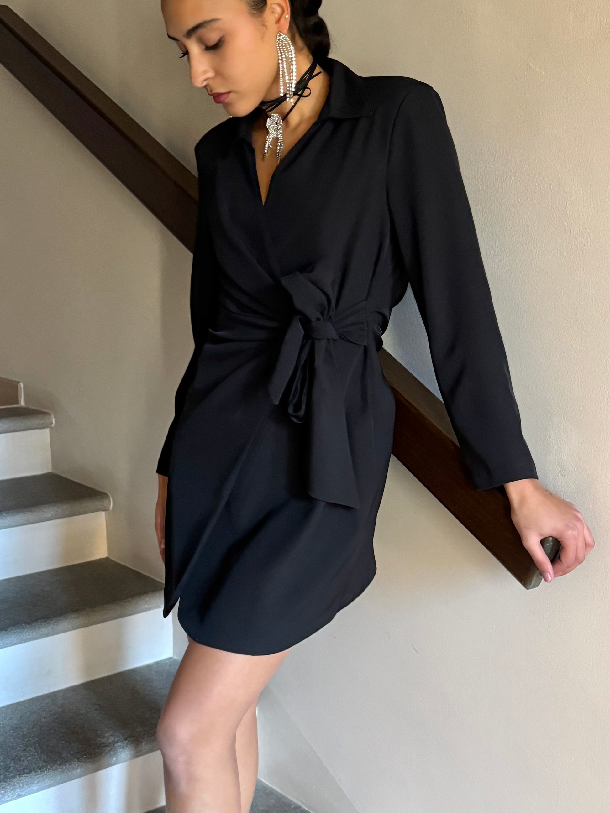 Abito ad incrocio con fiocco a chiusura con manica lunga e scollatura a V. Dettaglio colletto da camicia e scollatura a goccia profonda nella schiena.