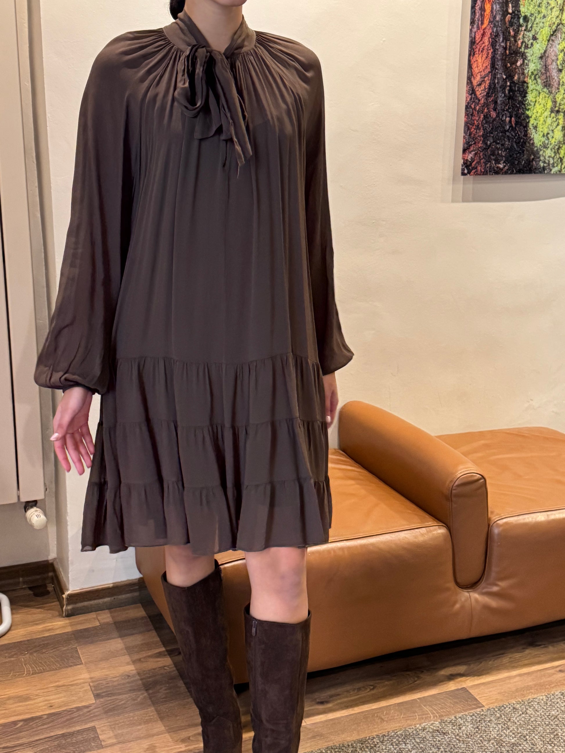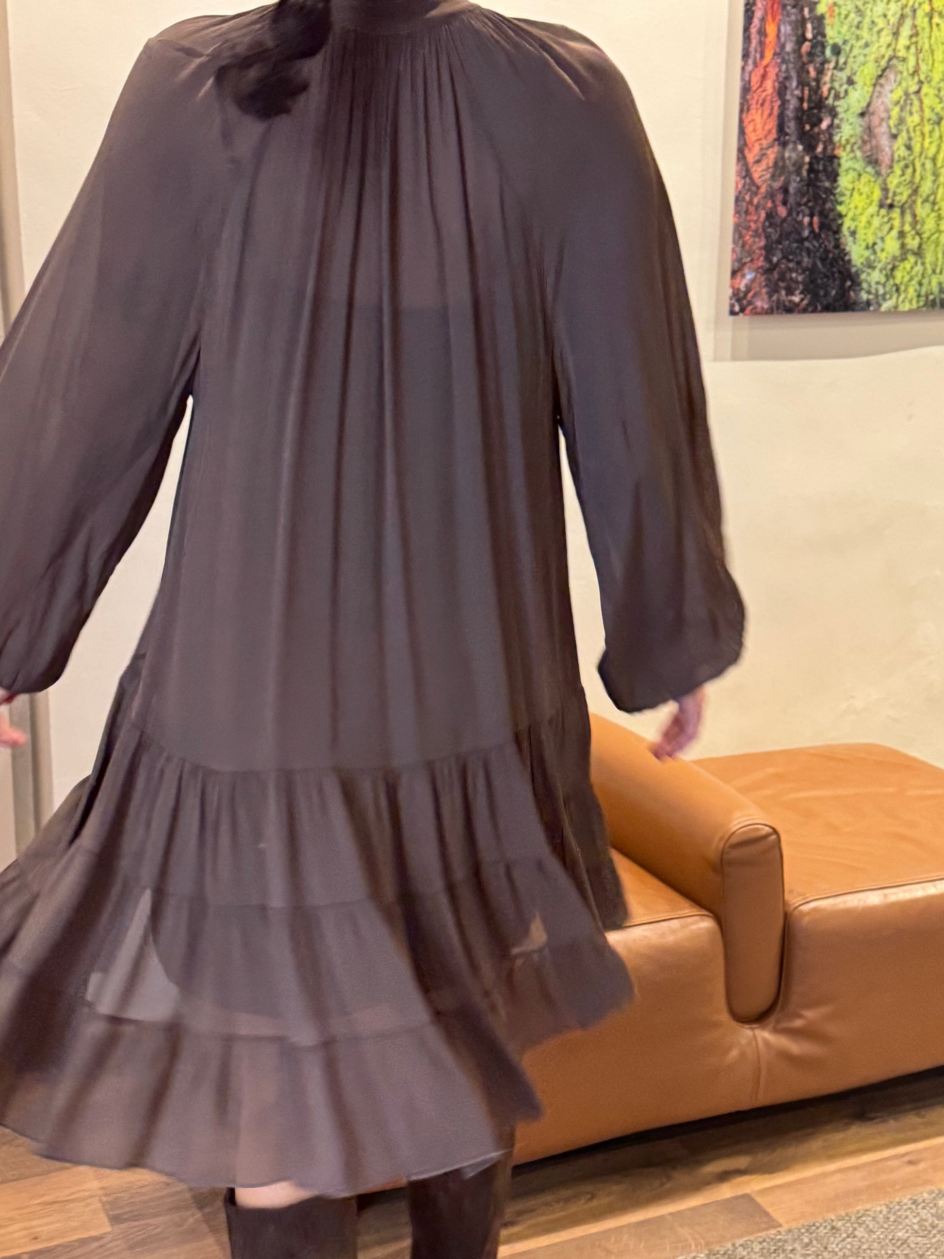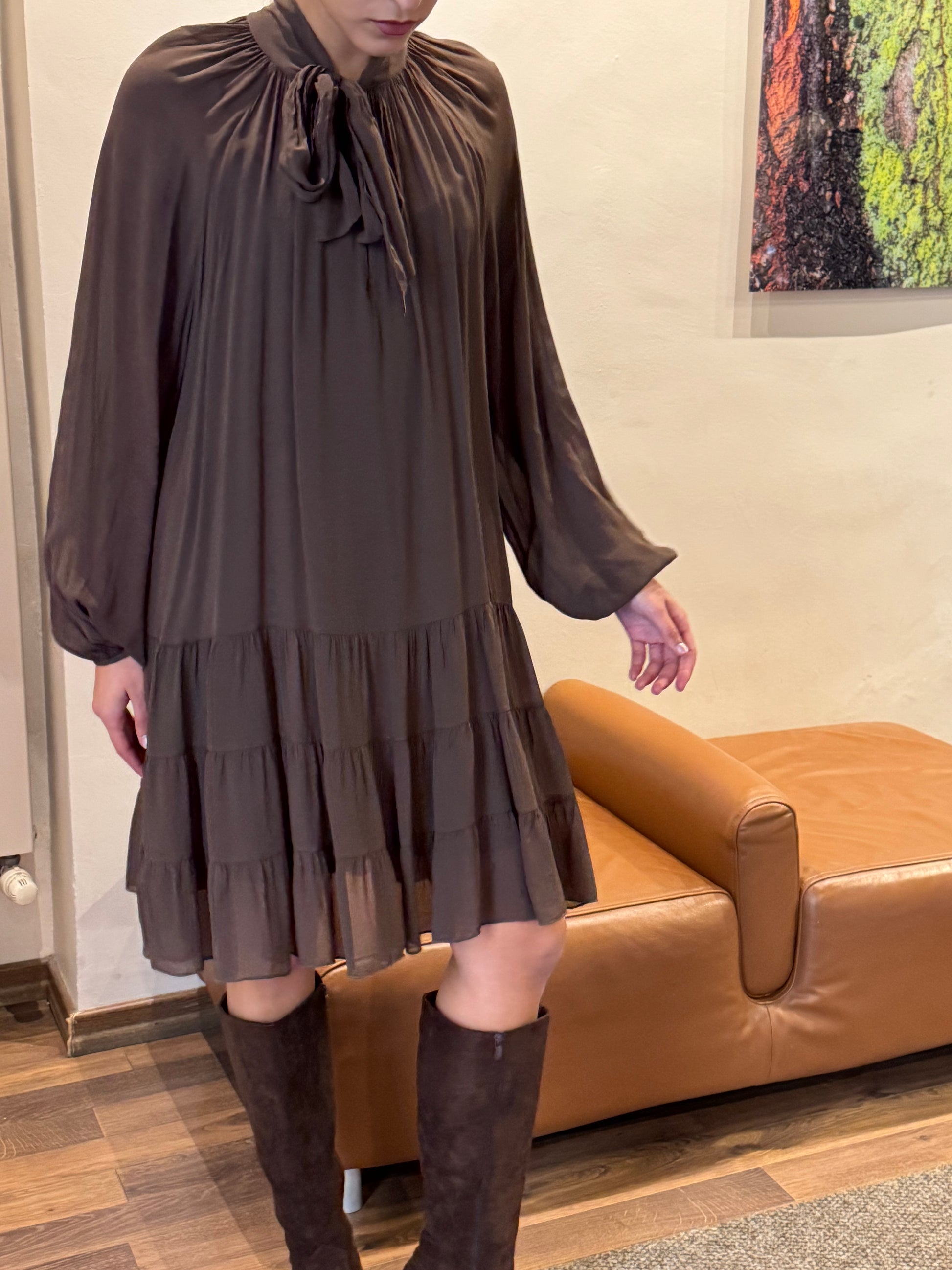 Abito legato al collo con balze sul fondo, color cioccolato. Materiale crêpe opaco, dotato di sottoveste tono su tono.