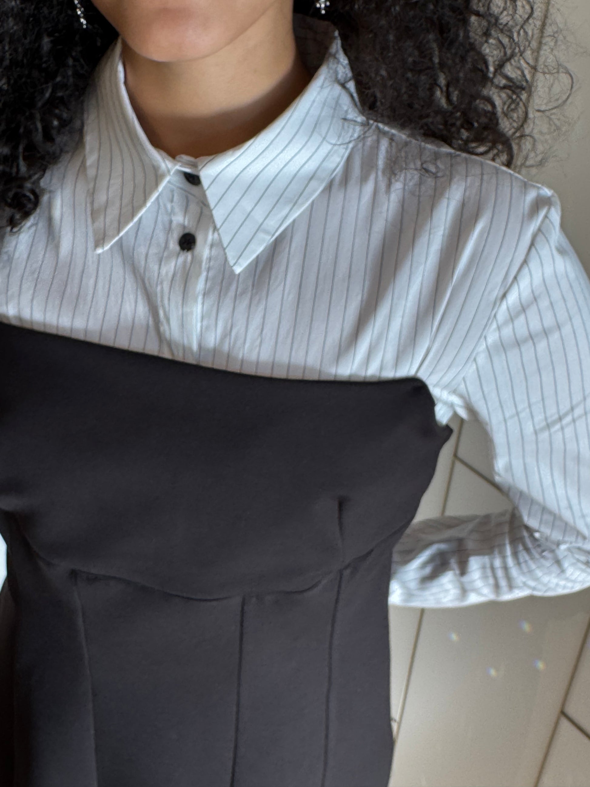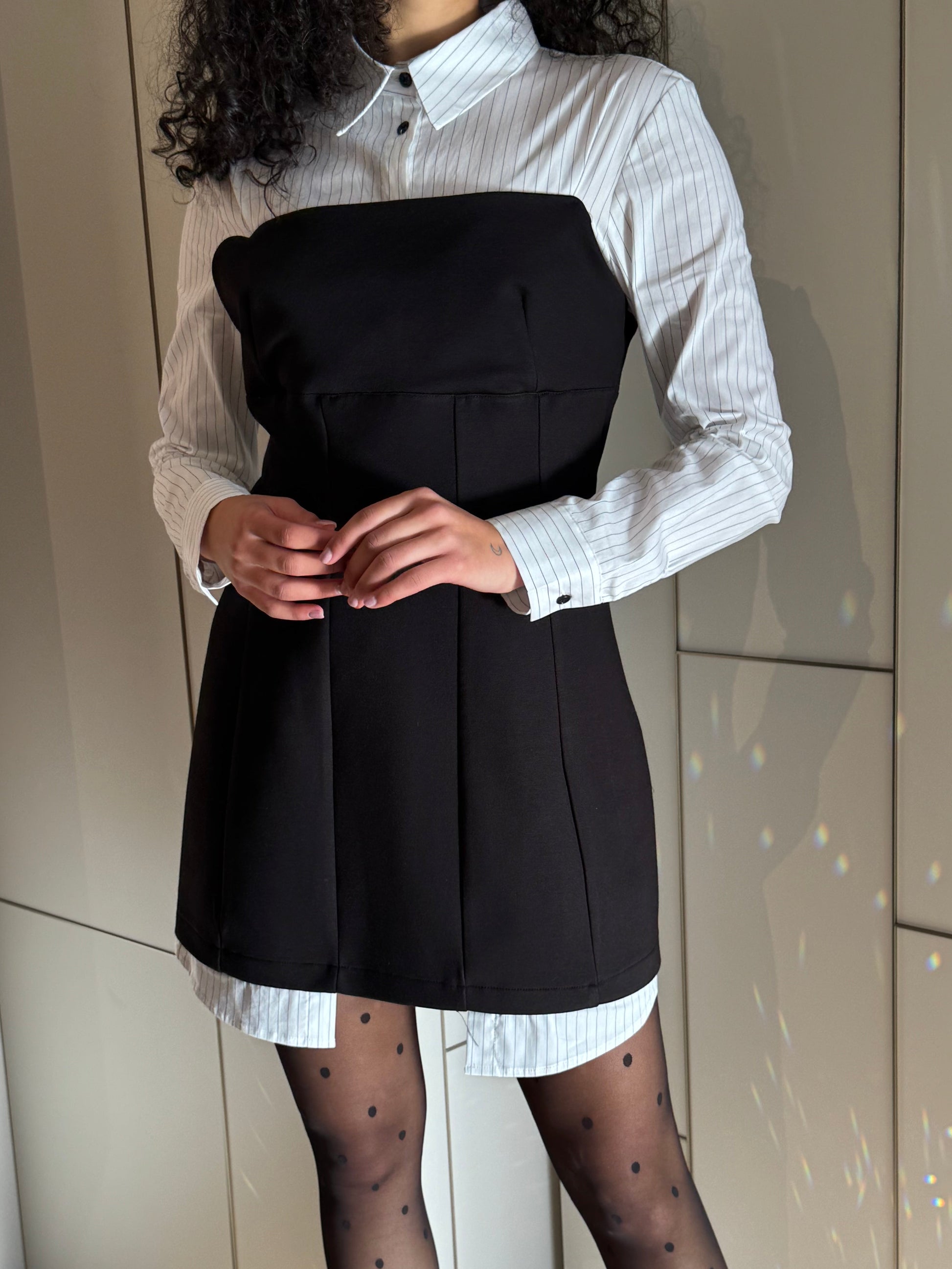 Abito corto con maniche lunghe formato da tubino nero con parte superiore effetto camicia rigata e dettaglio anche sul fondo a riporto. Colletto e polsini nella manica, chiusura laterale con cerniera invisibile.