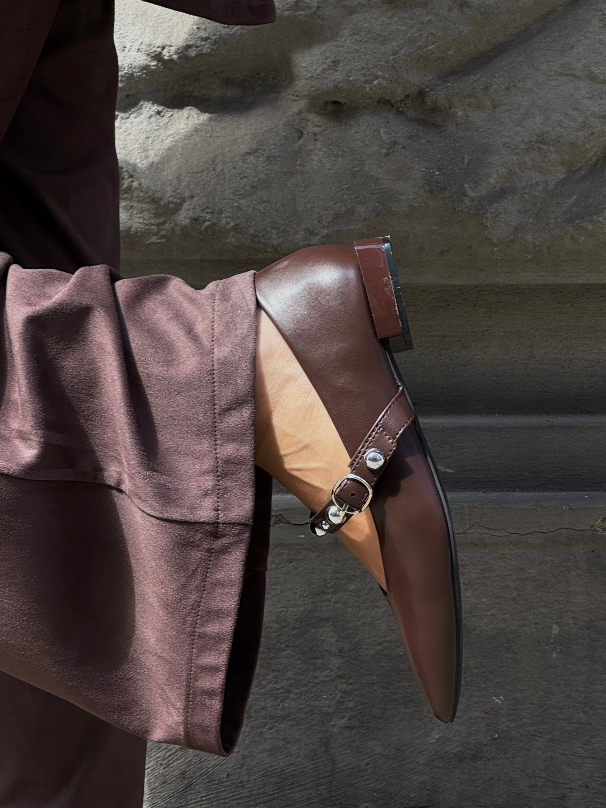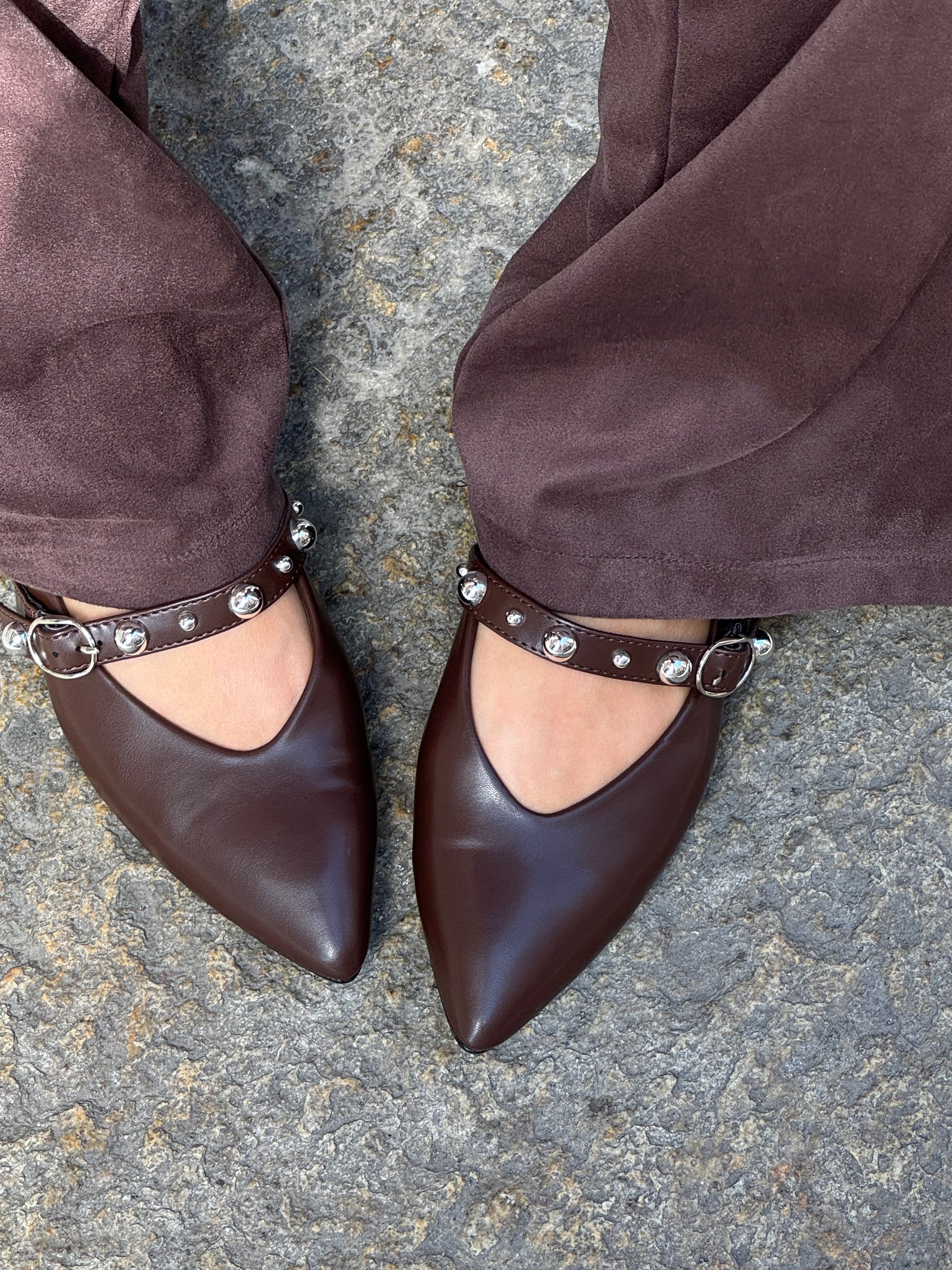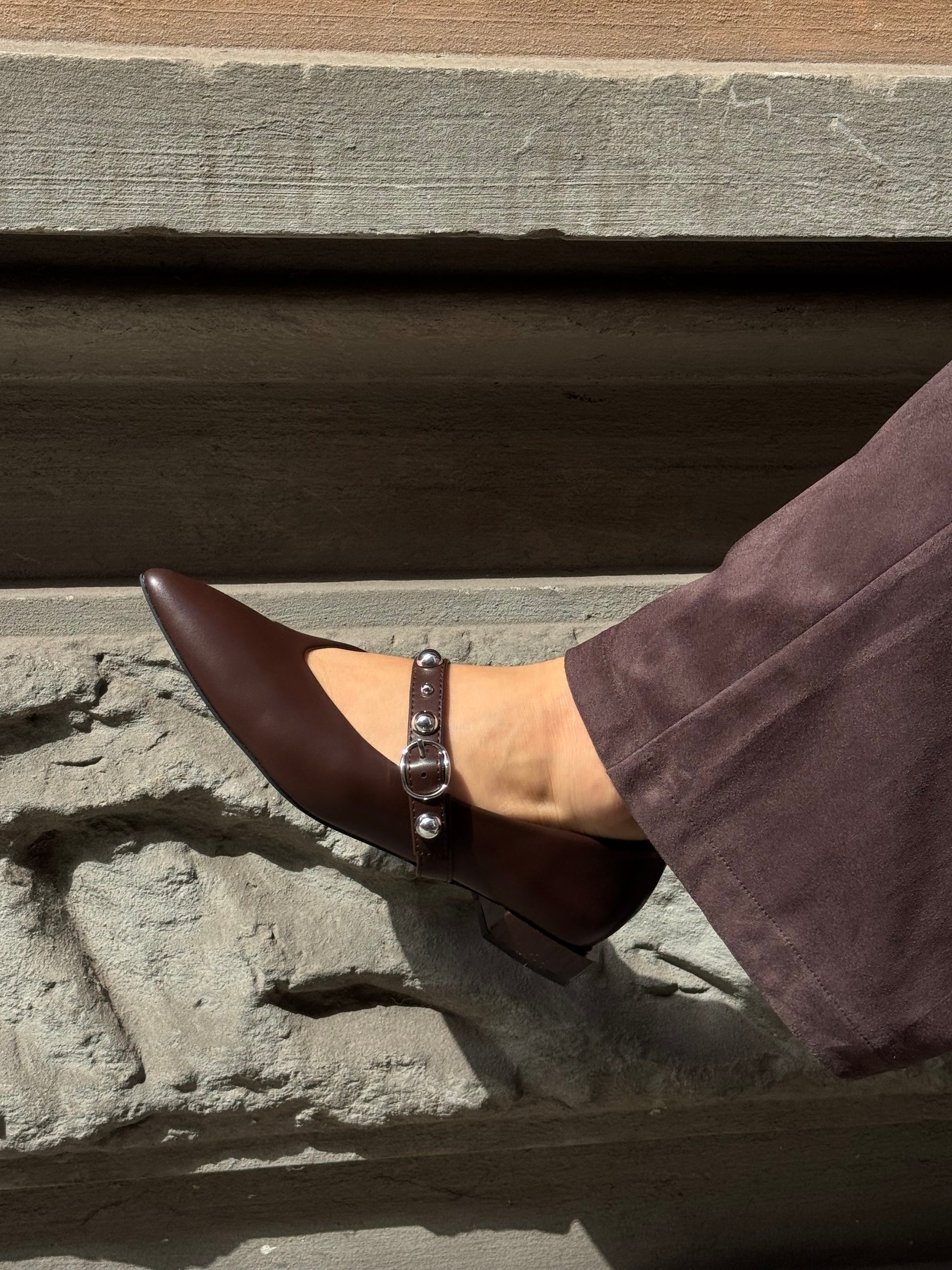 Ballerina a punta color caffè con tacco squadrato. In ecopelle, con cinghietto borchiato color argento.