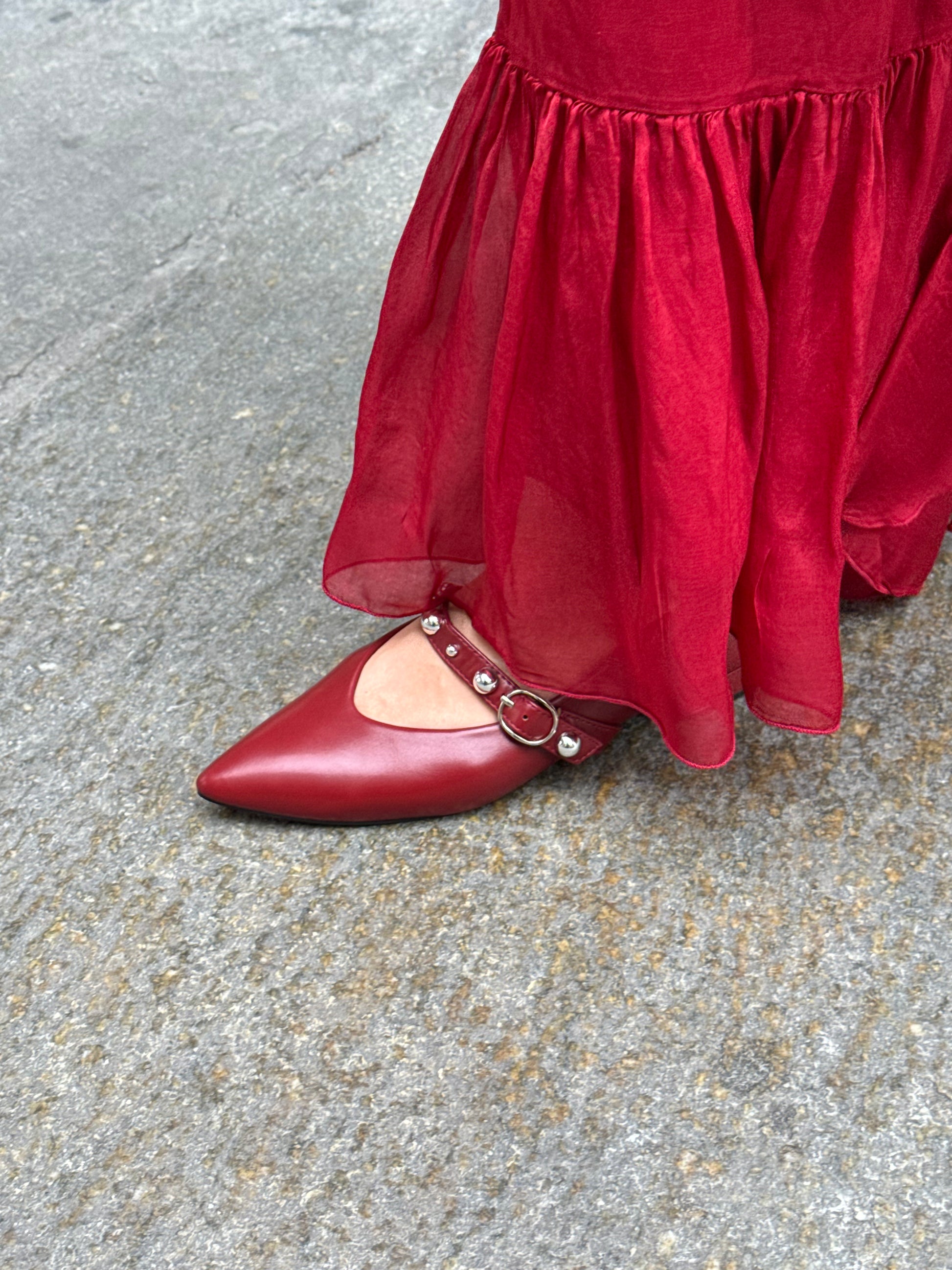 Ballerina a punta color rosso con tacco squadrato. In ecopelle, con cinghietto borchiato color argento.