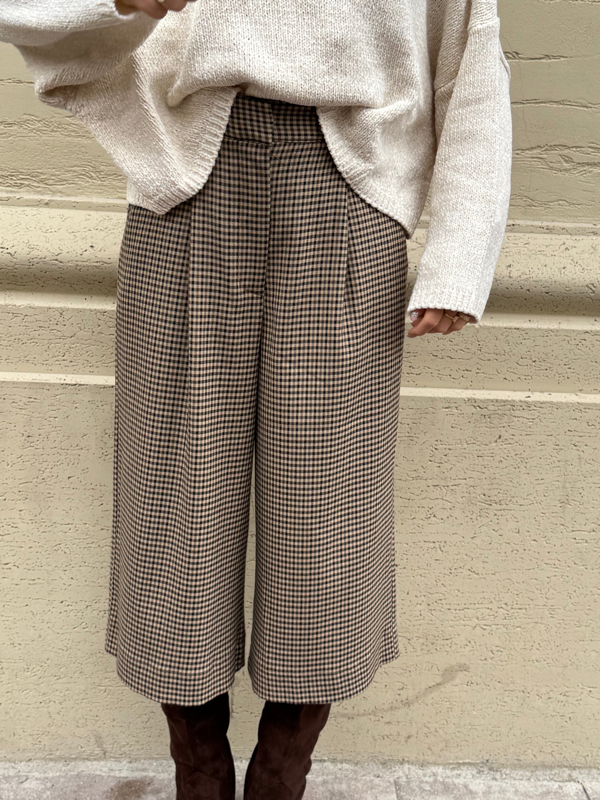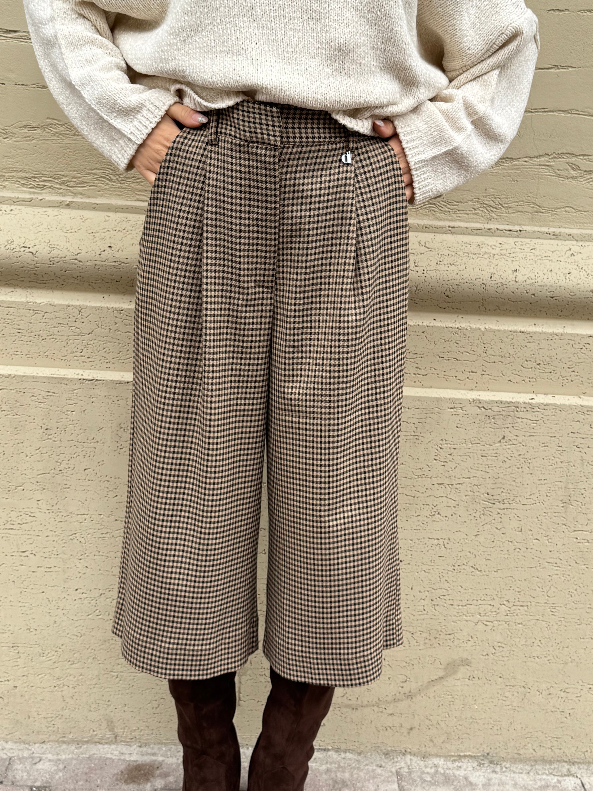 Bermuda in fantasia quadretti con tasche e pinces. Passati per cintura in vita, chiusura a cerniera sul davanti.