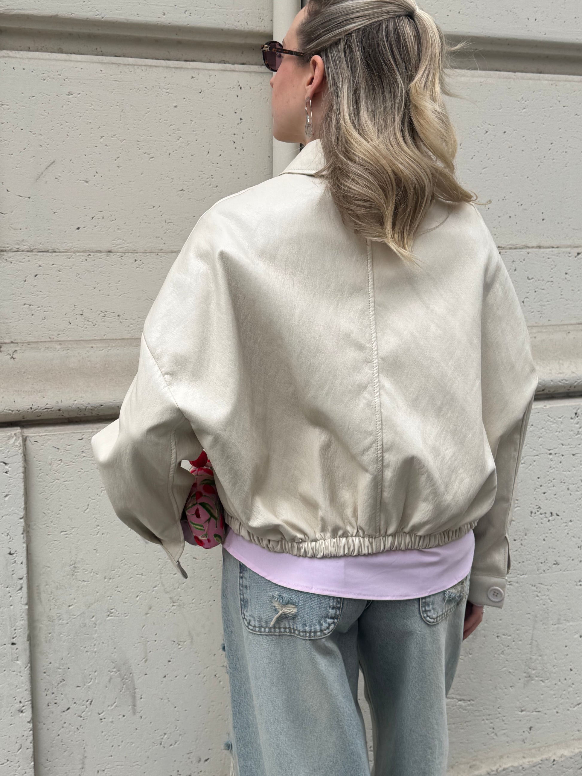Bomber oversize in leggera ecopelle color avorio, bottoni tono su tono, due tasche applicate ed elastico sul fondo. Sfoderato all’interno.