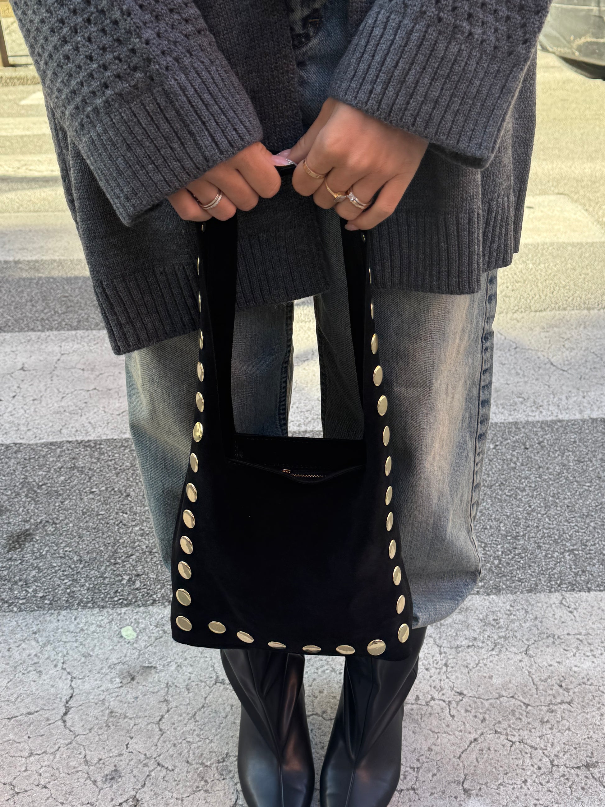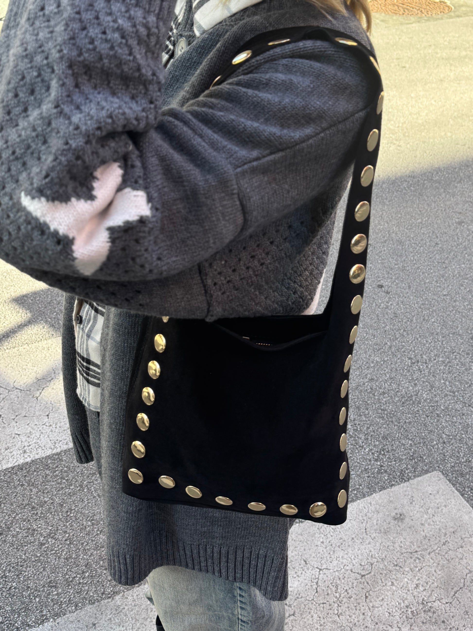 Borsa in vera pelle scamosciata color testa nero con manico largo. Applicazioni di borchie dorate lungo la bordatura. Chiusura a zip, dorata di tracolla a catena dorata.