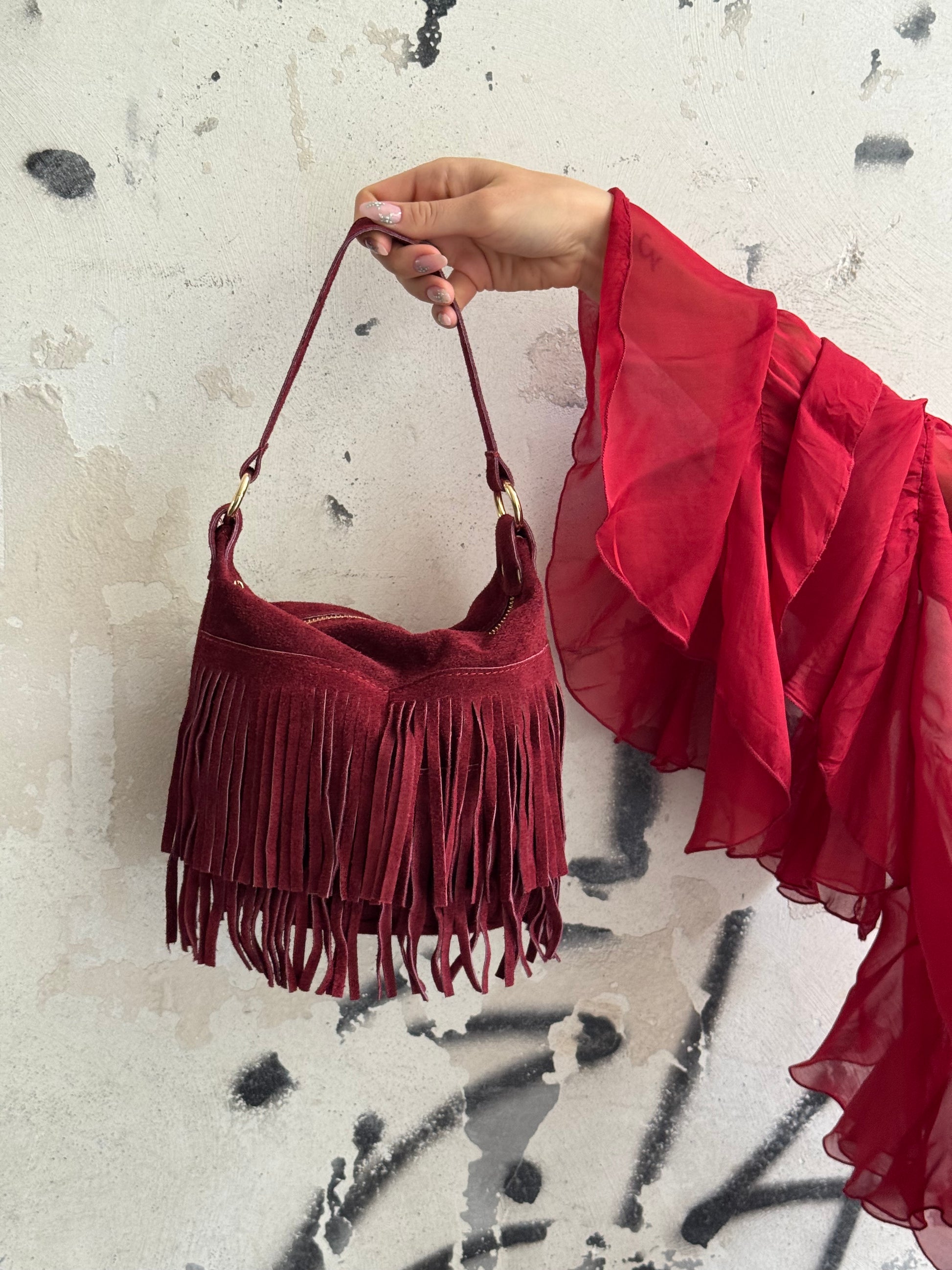 Borsa con frange in pelle scamosciata color bordeaux. Chiusura a zip oro, dotata di tracolla in coordinato. Vera pelle Made in Italy.