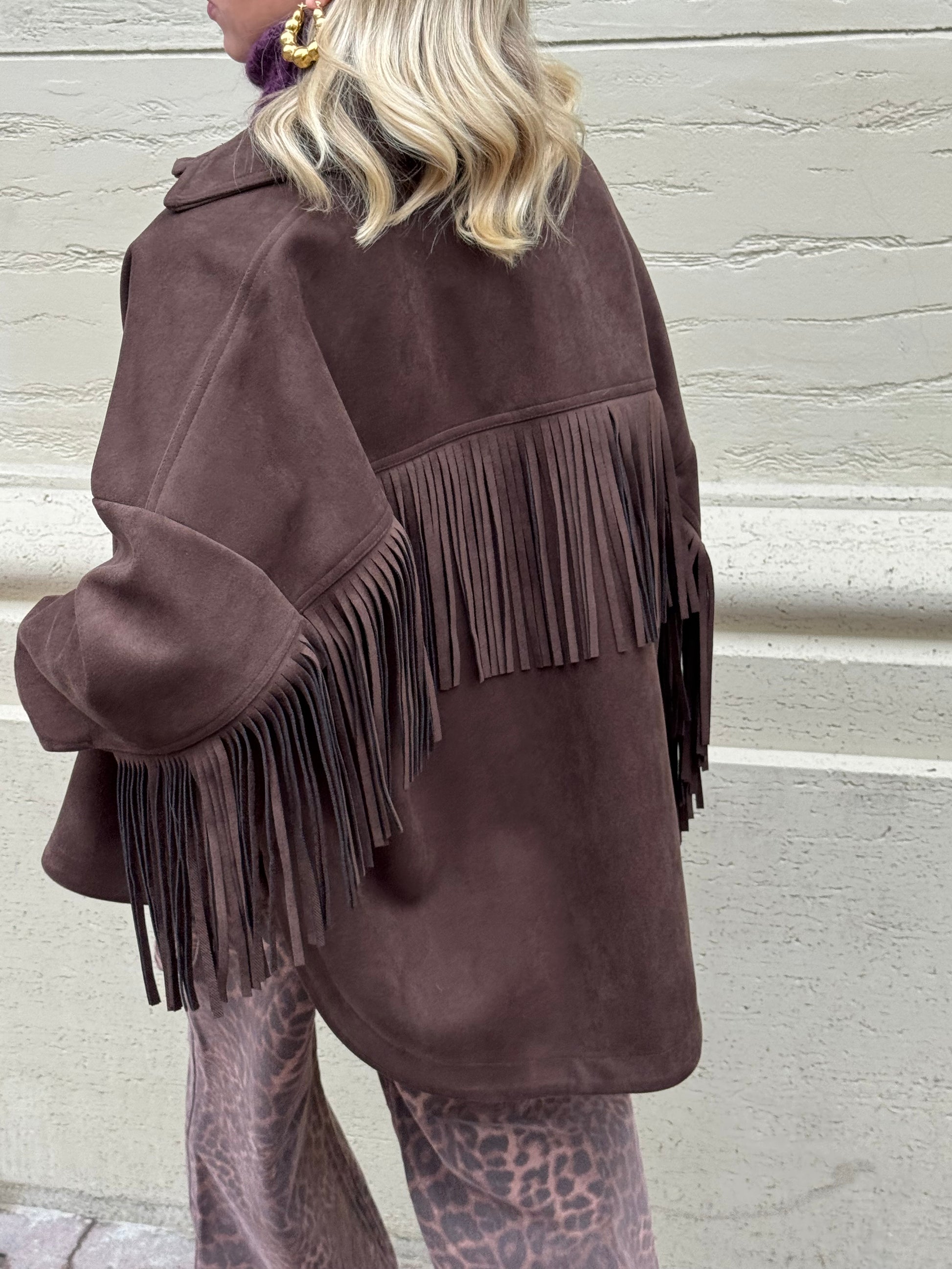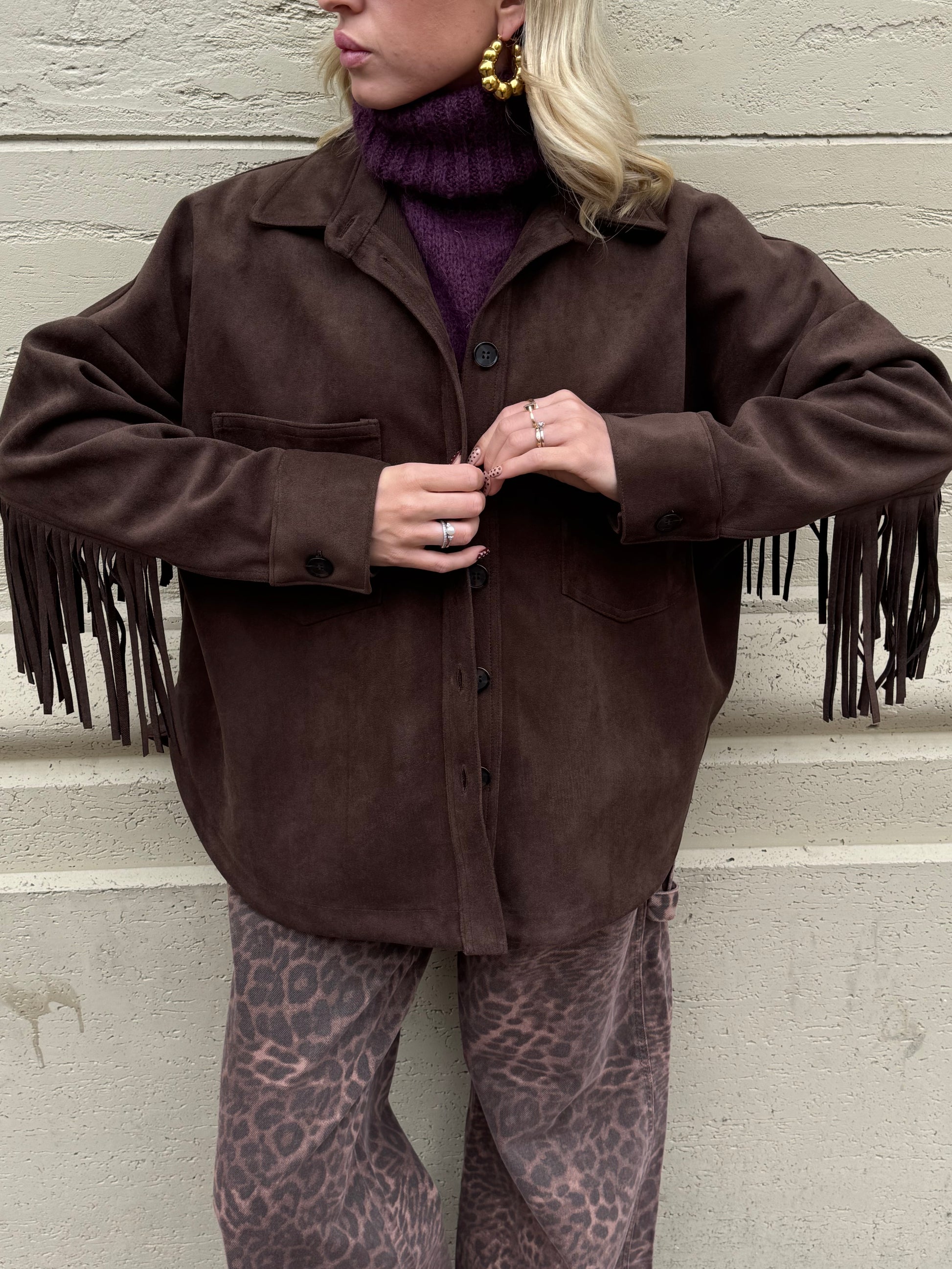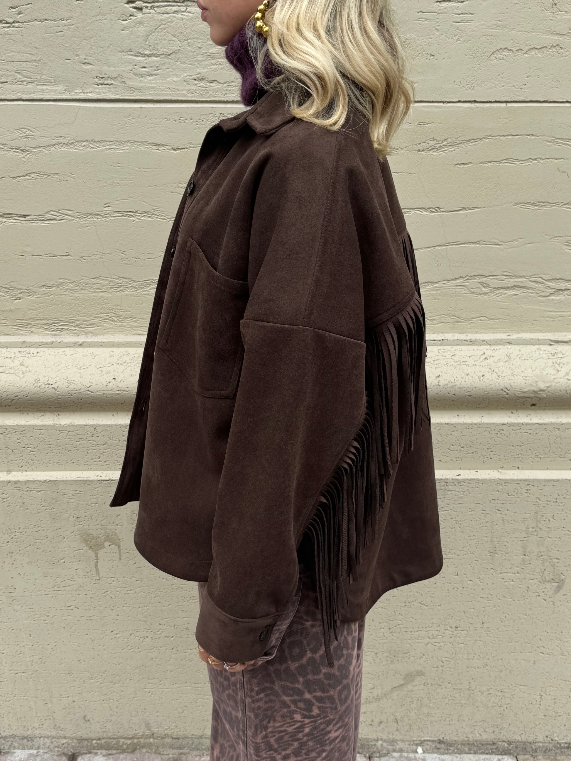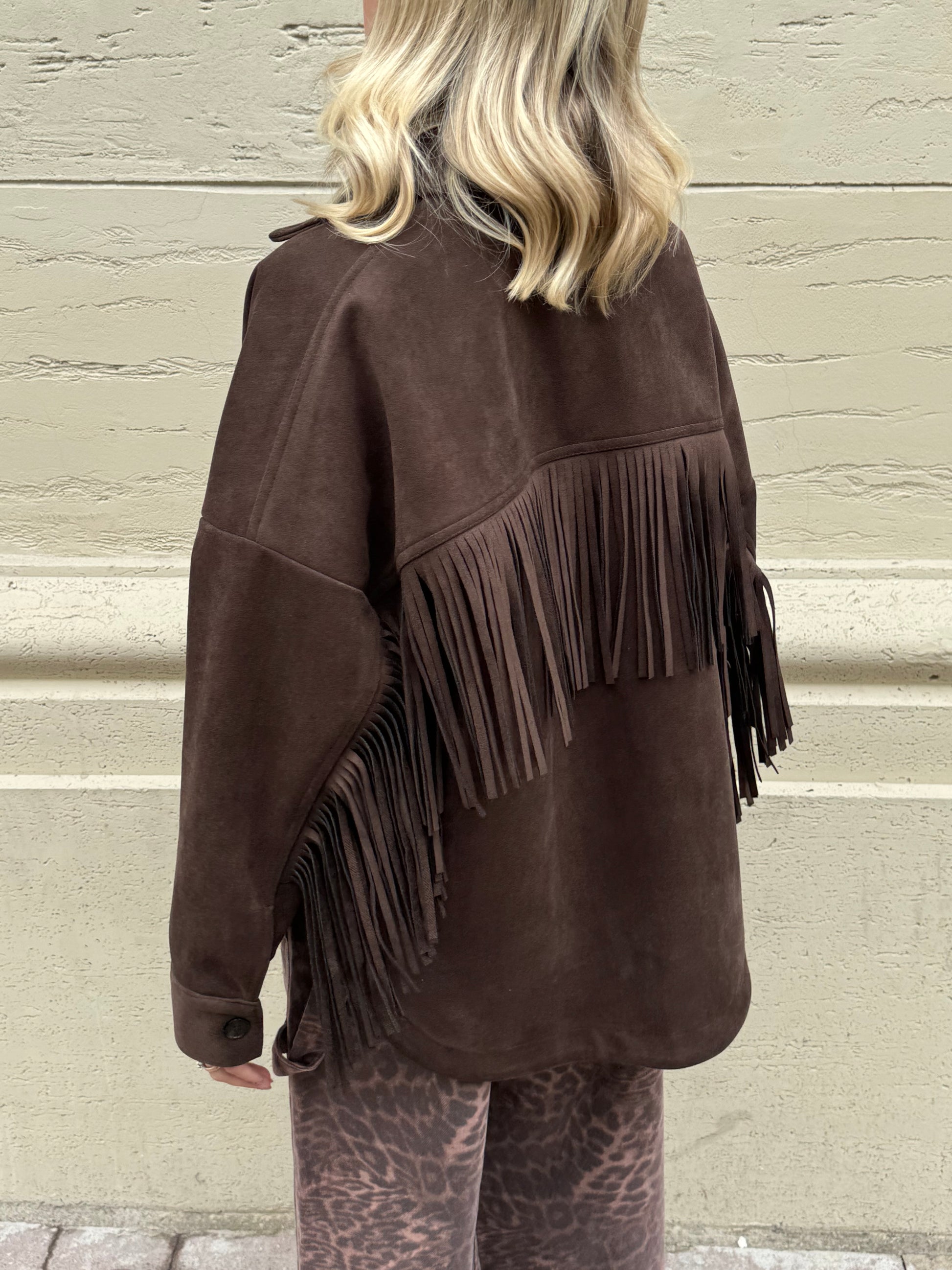 Giacca/Camicia oversize in ecopelle effetto daino nel moro. Dettaglio frange sul retro schiena. Colletto e chiusura a bottoni frontale a pressione in metallo.