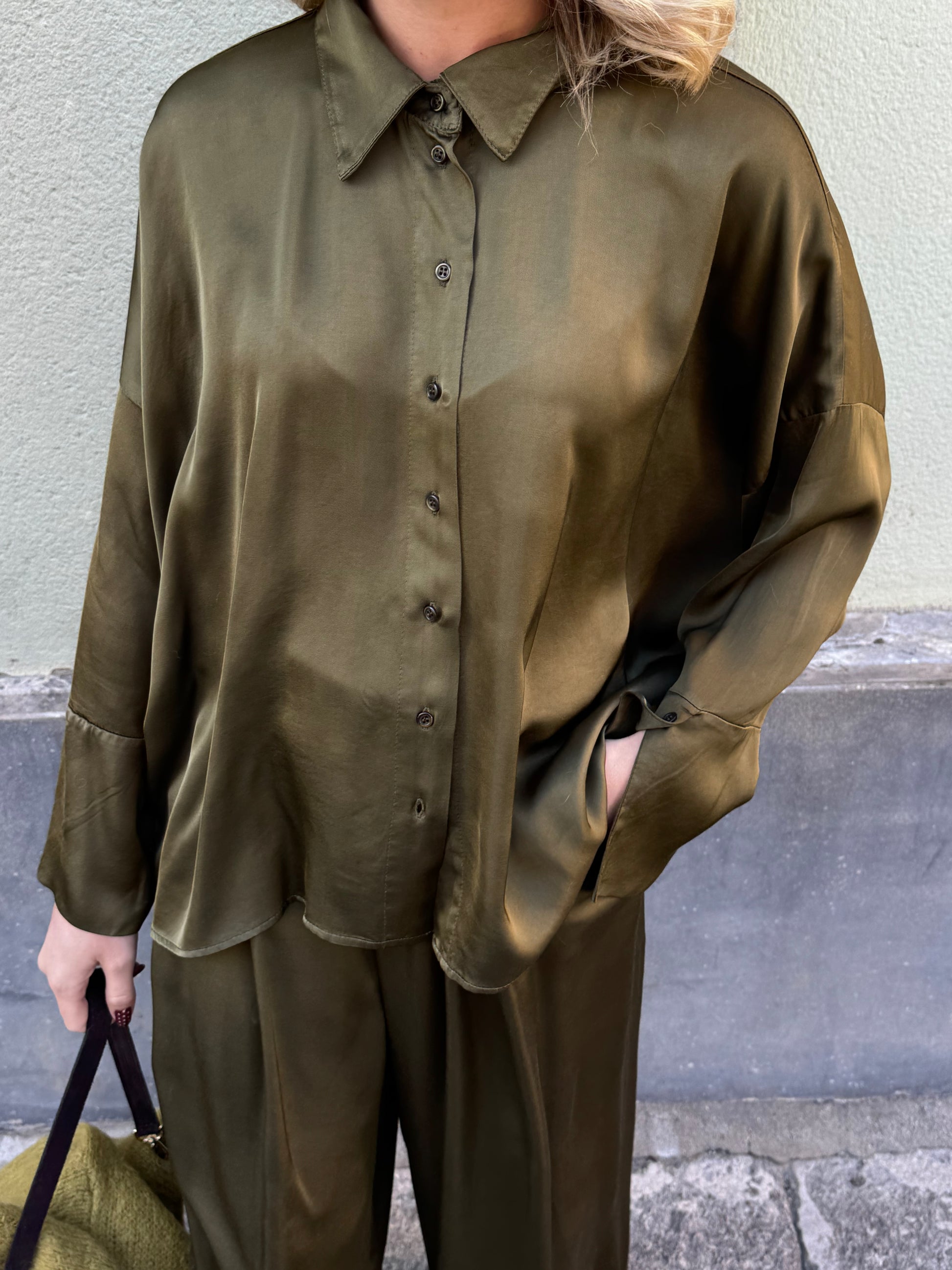 Camicia in satin 100%viscosa color oliva. Modello a scatola, polsini alti e colletto classico. Bottoni tono su tono.