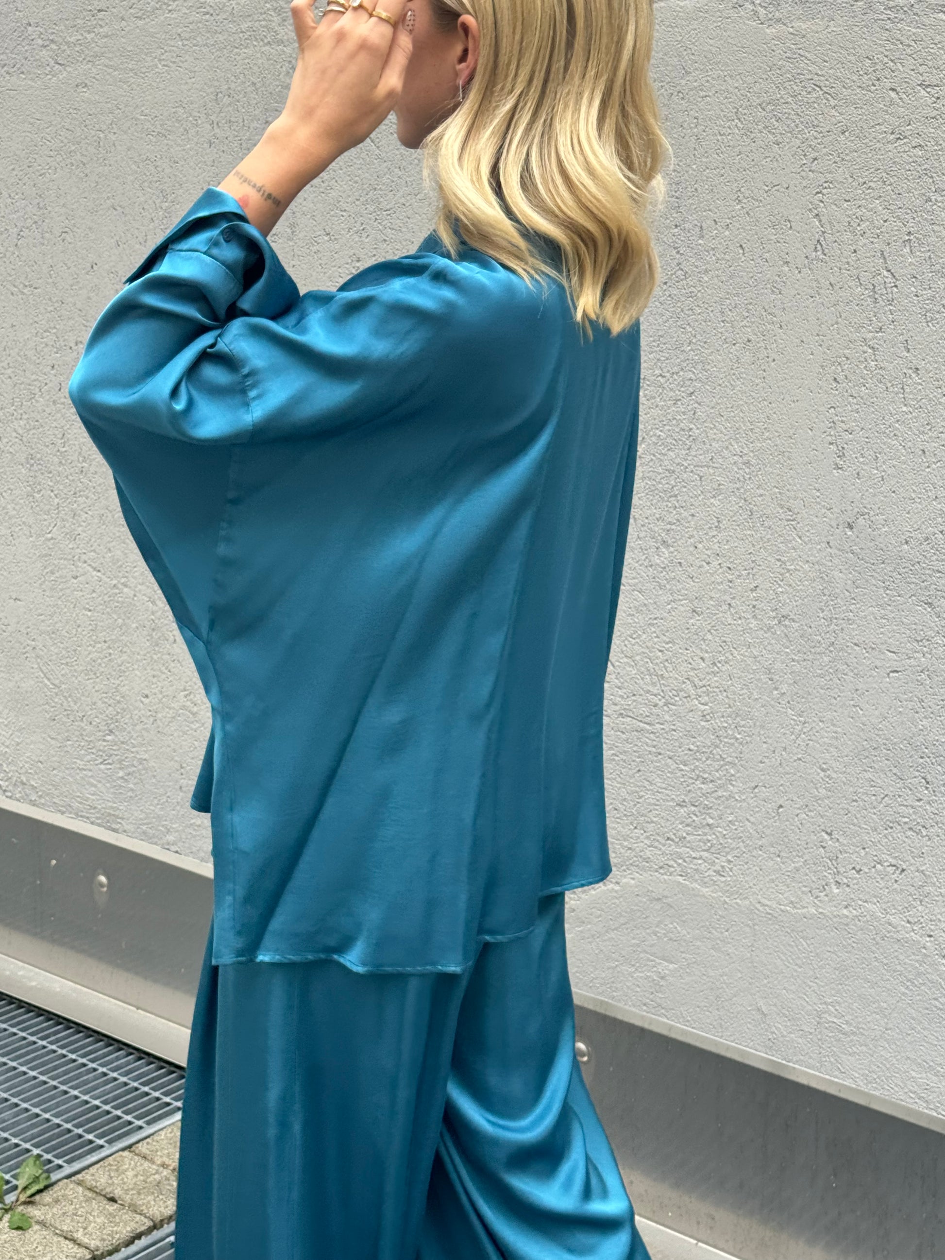 Camicia in satin 100%viscosa color ottanio. Modello a scatola, polsini alti e colletto classico. Bottoni tono su tono.