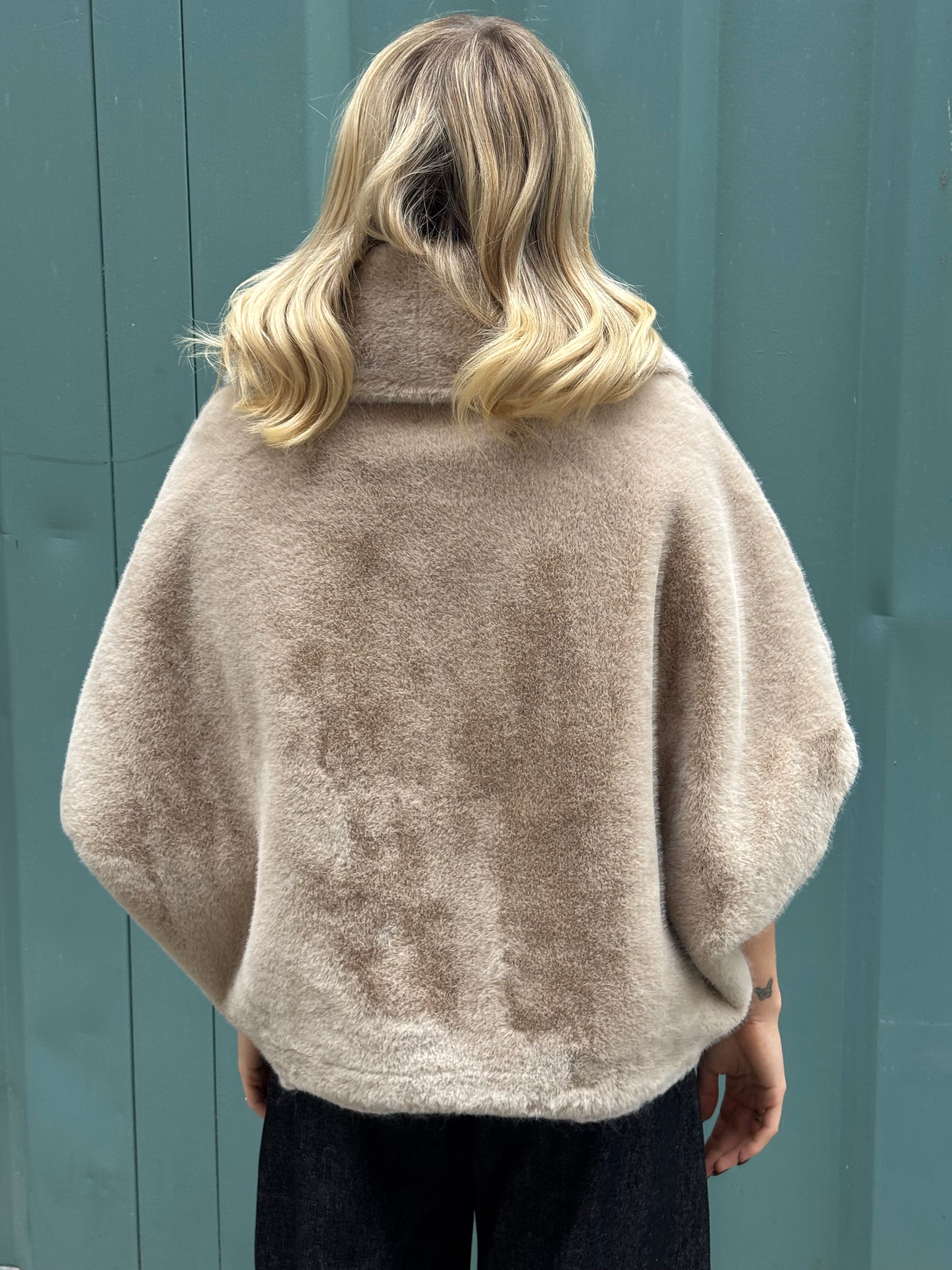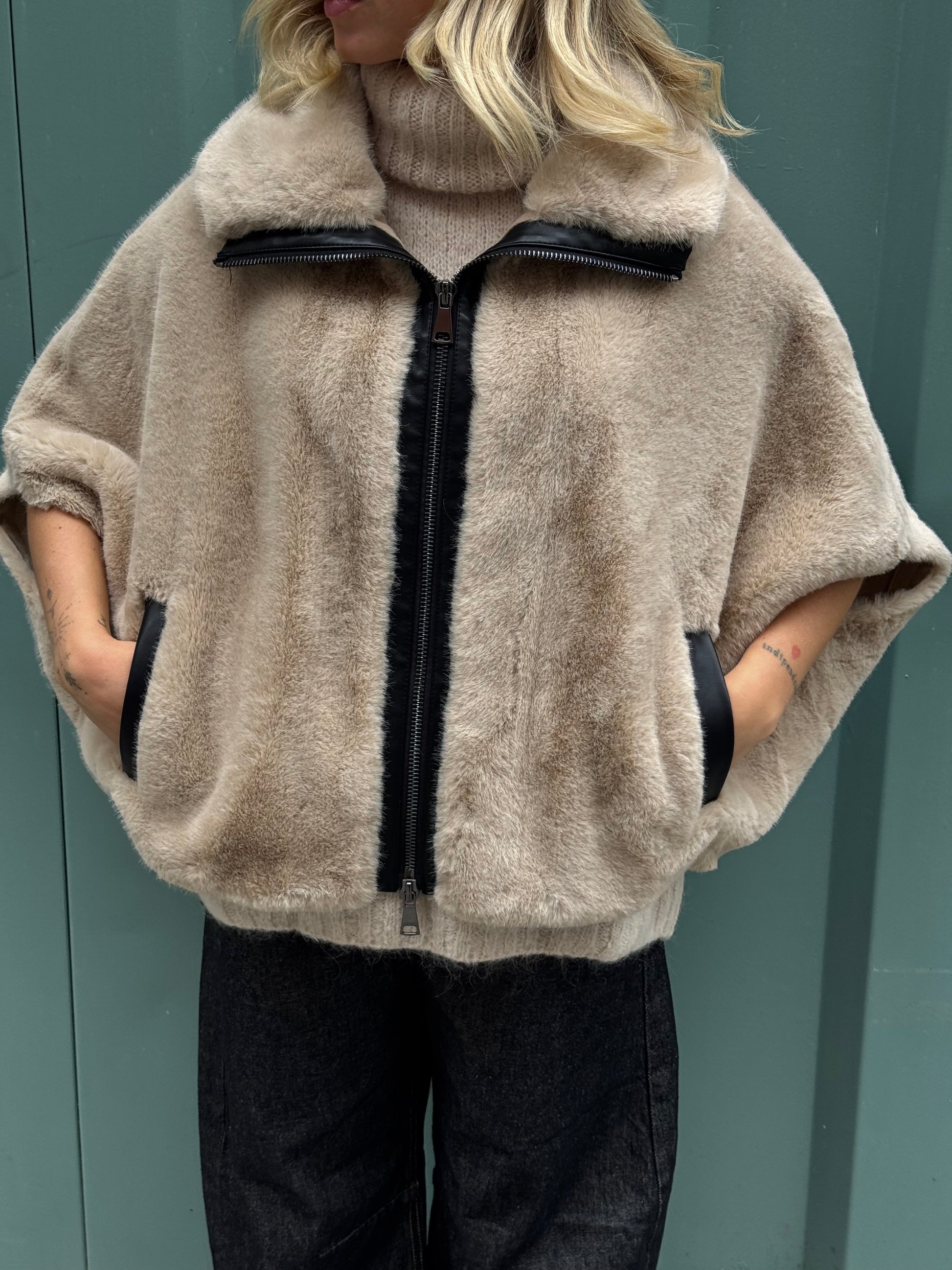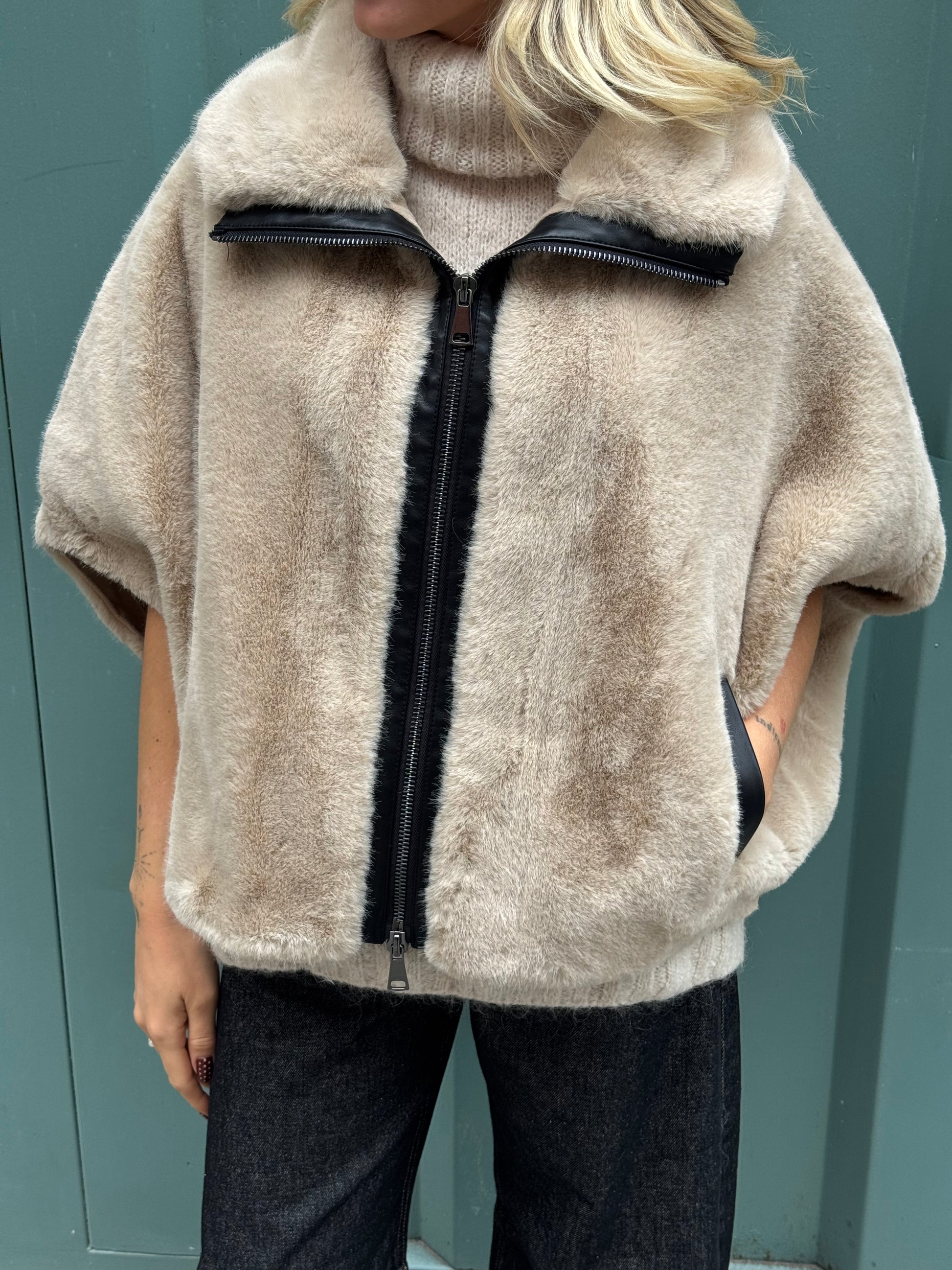 Cappa in ecopelliccia rasata effetto visone color gesso, rifinita con dettagli in ecopelle nera. Chiusura a cerniera argento e tasche laterali, interno in eco montone.