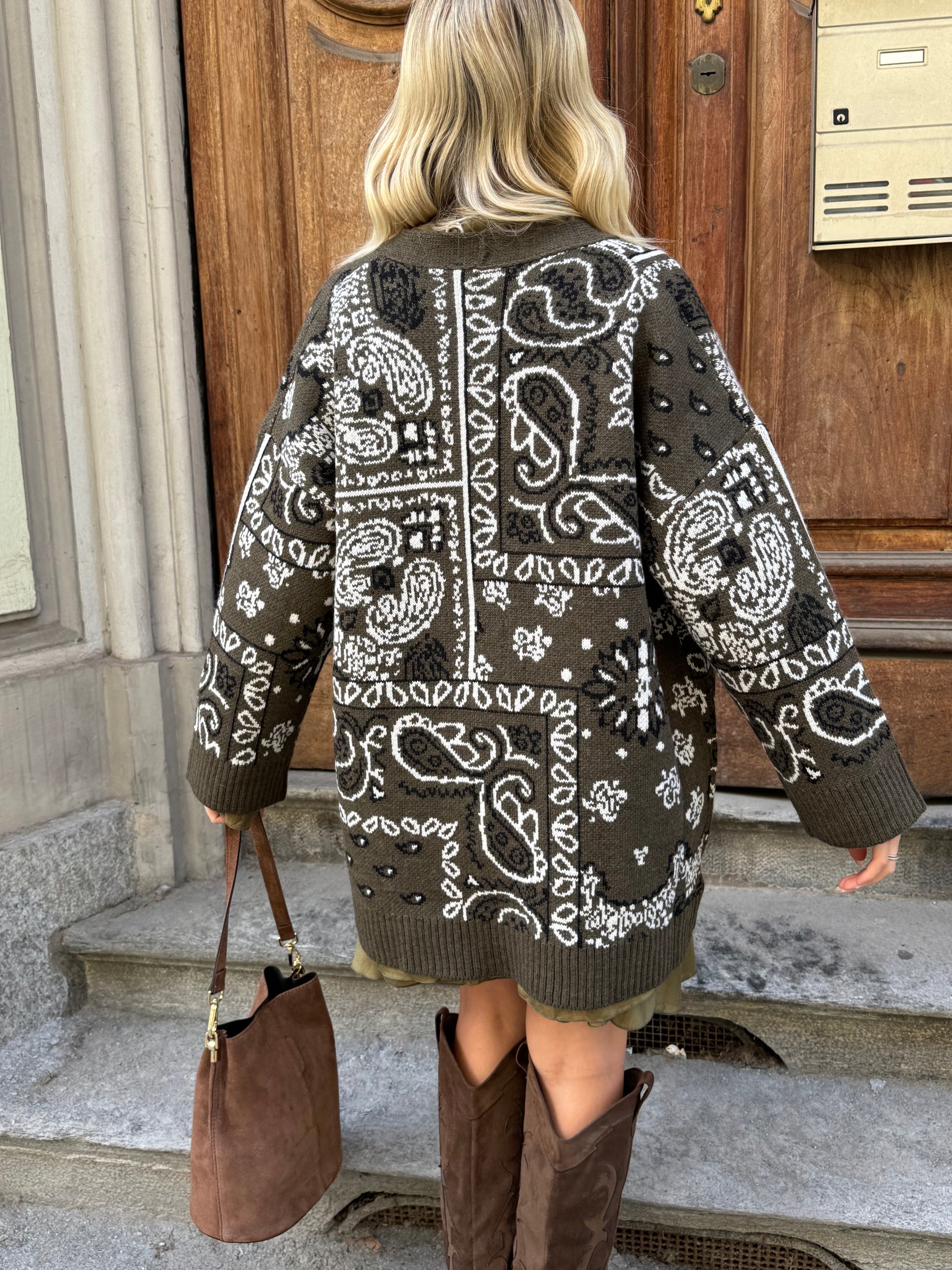 Cardigan oversize abbottonato stampa bandana, base verde militare.