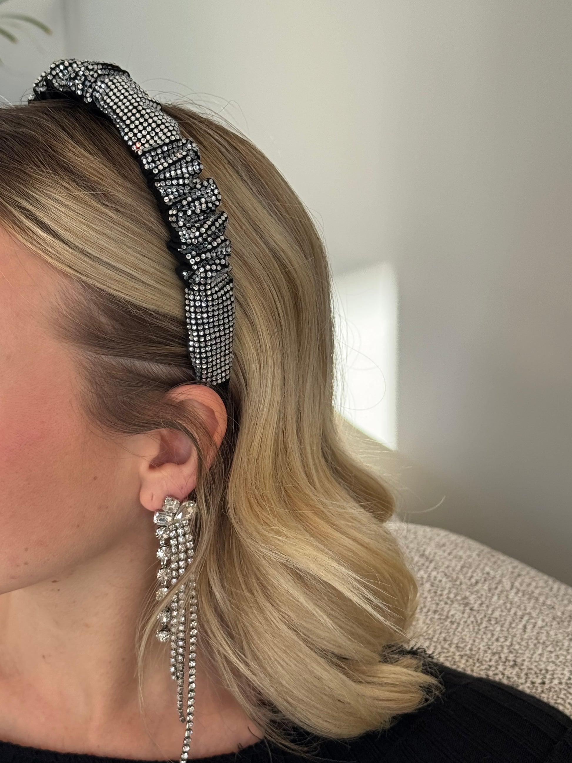 Cerchietto rigido in tessuto nero con strass argento.