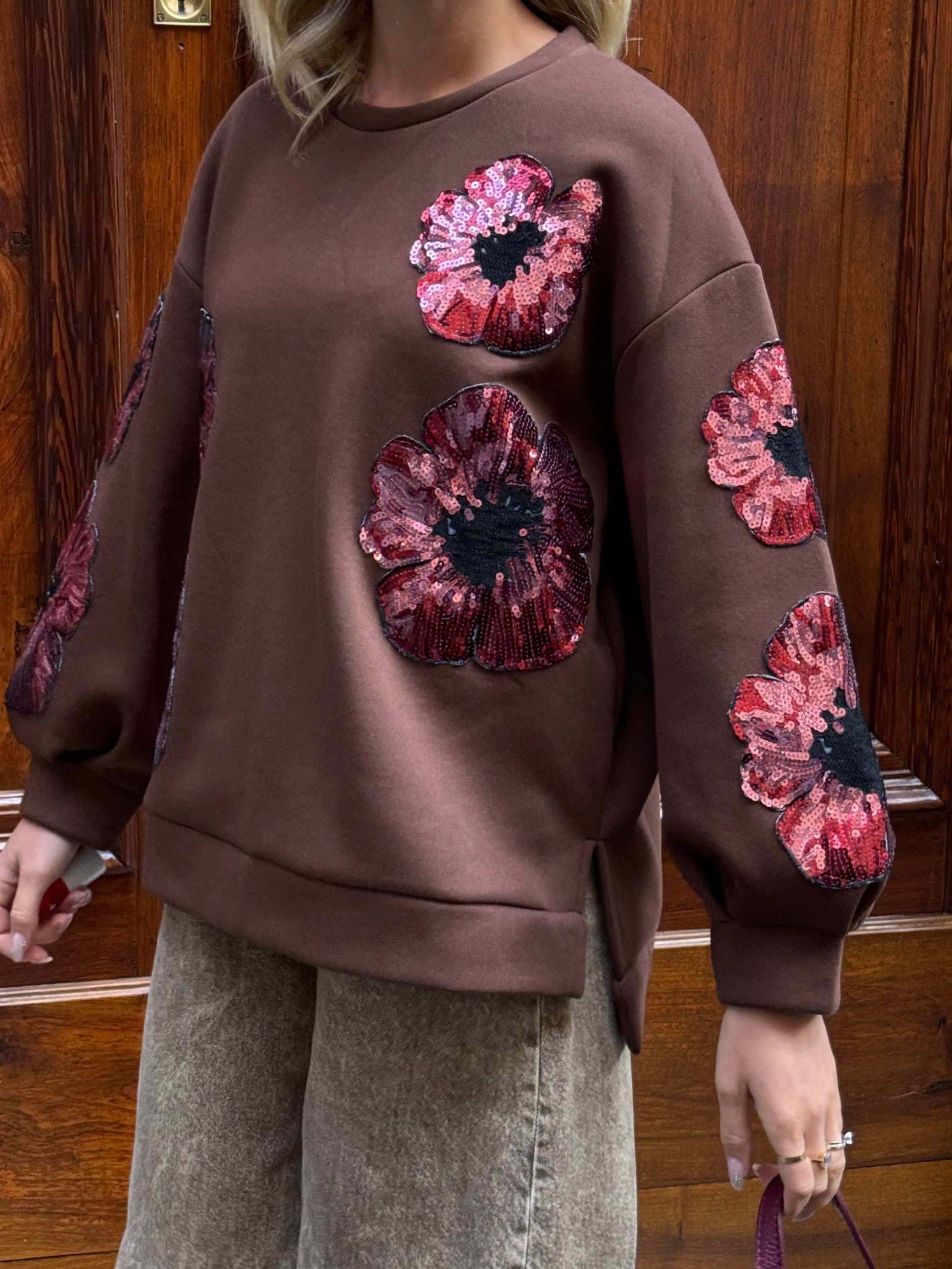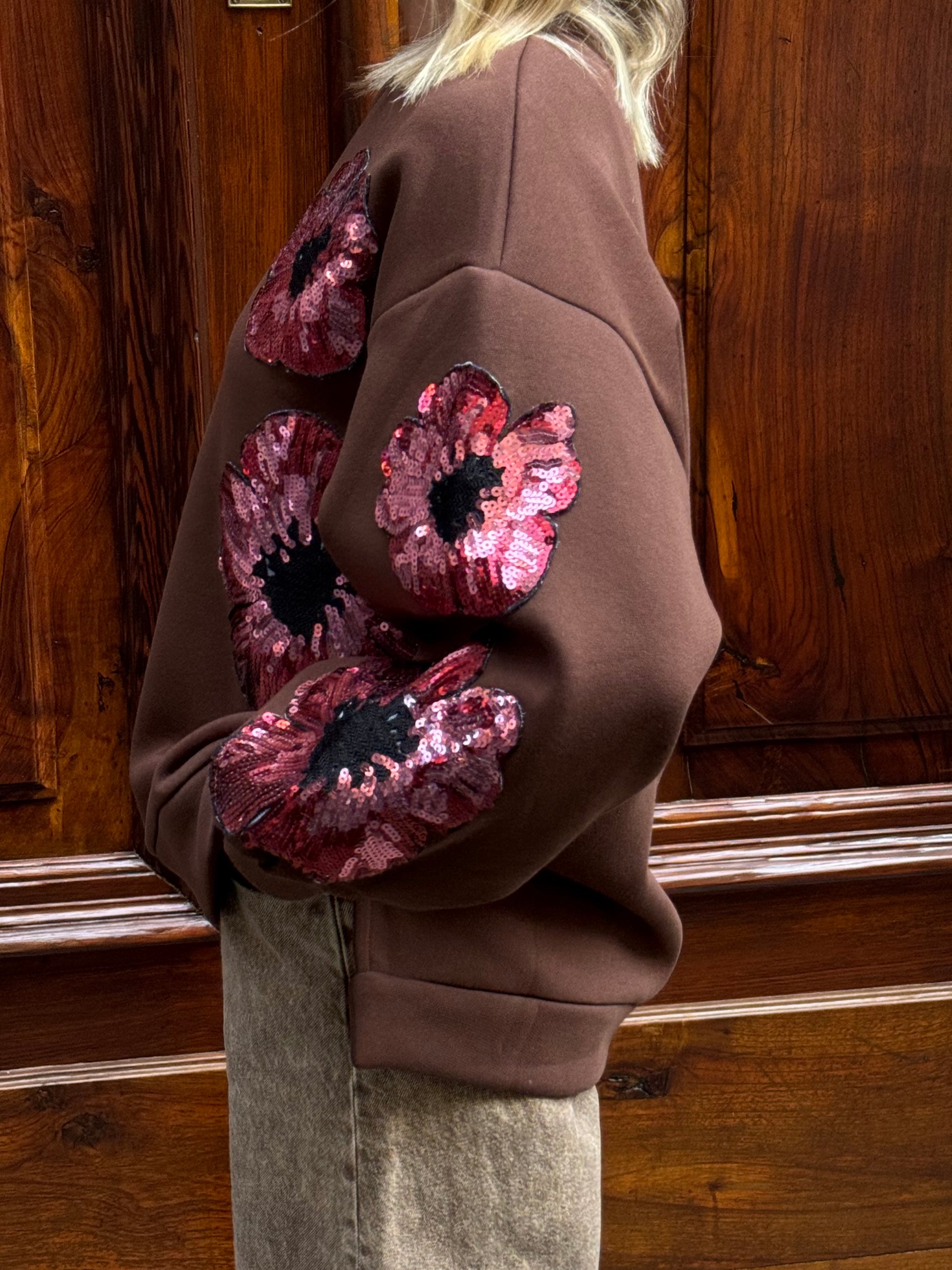 Felpa oversize color cioccolato con fiori di paillettes ricamati. Manica lunga a palloncino e girocollo. Felpata all’interno.
