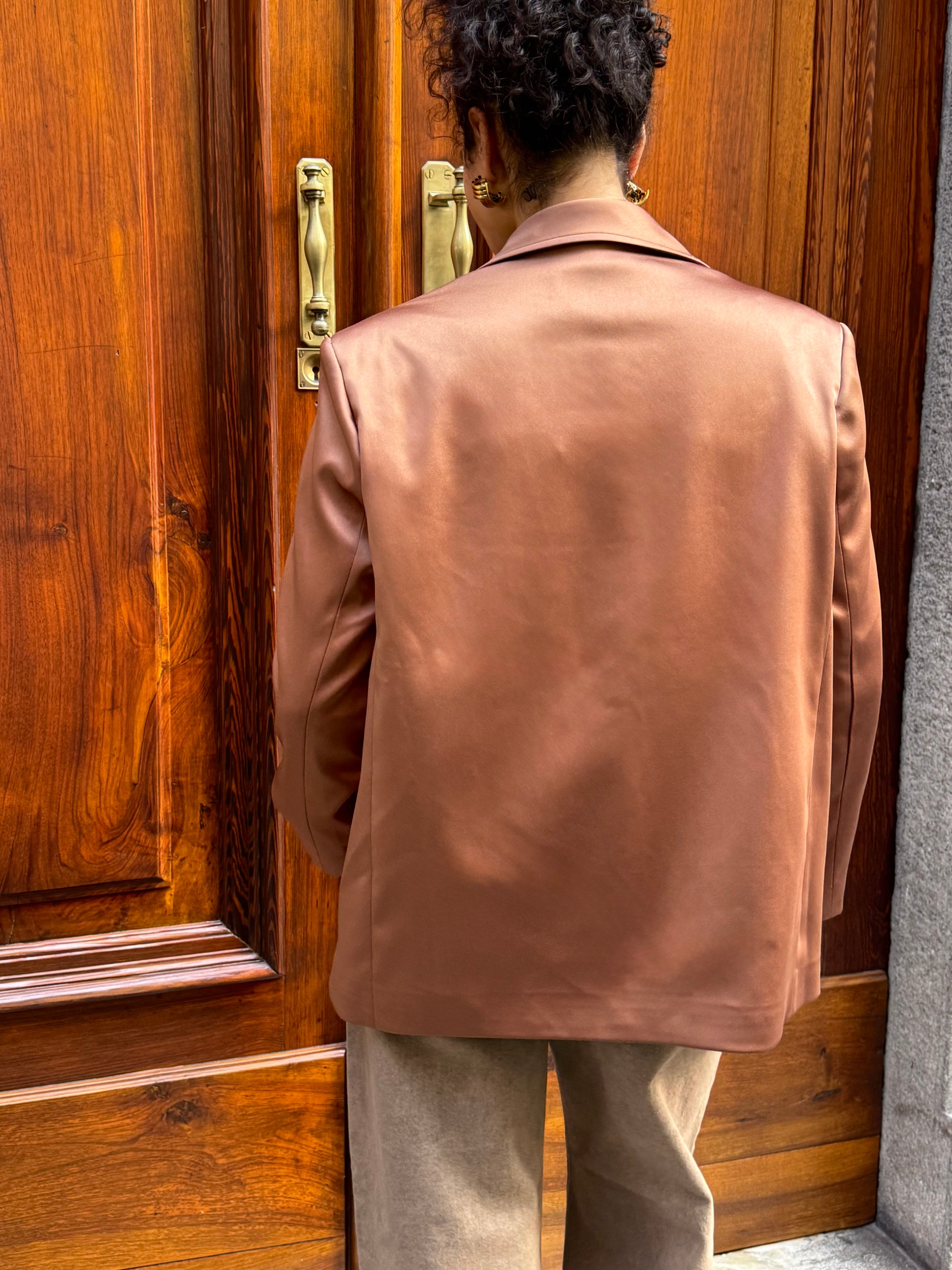 Giacca dal taglio maschile monopetto, foderata, con spalline. In raso color bronzo.