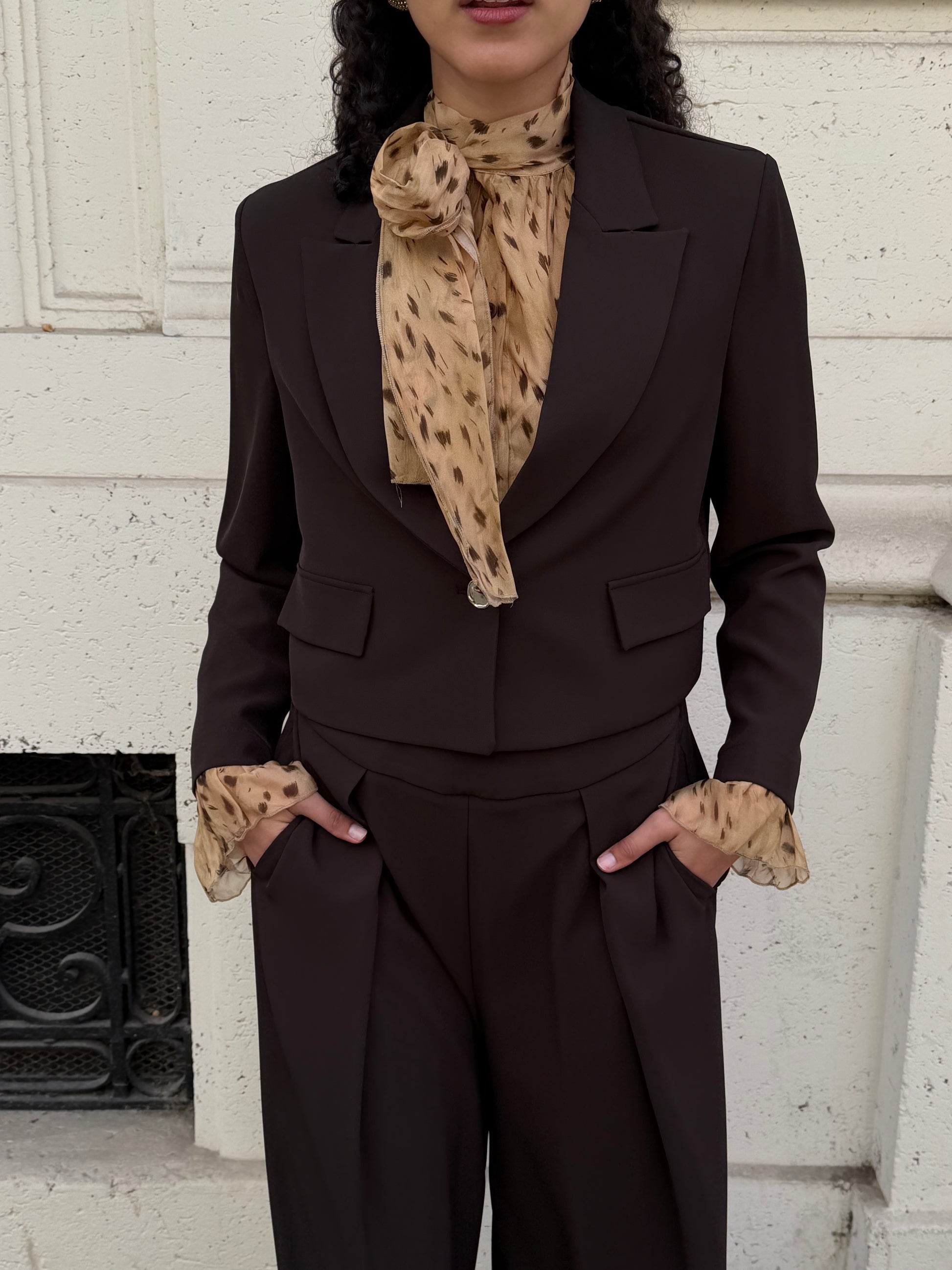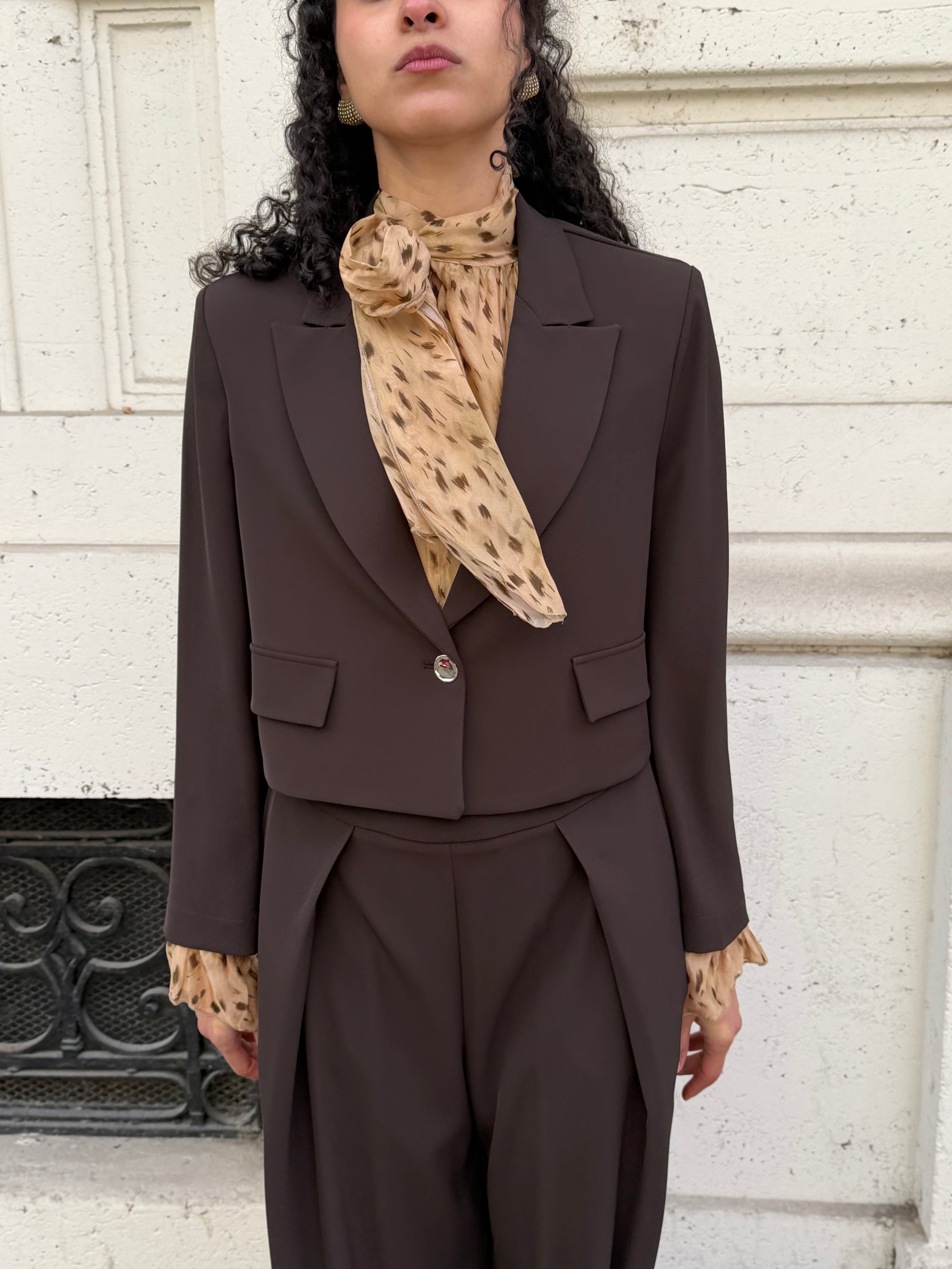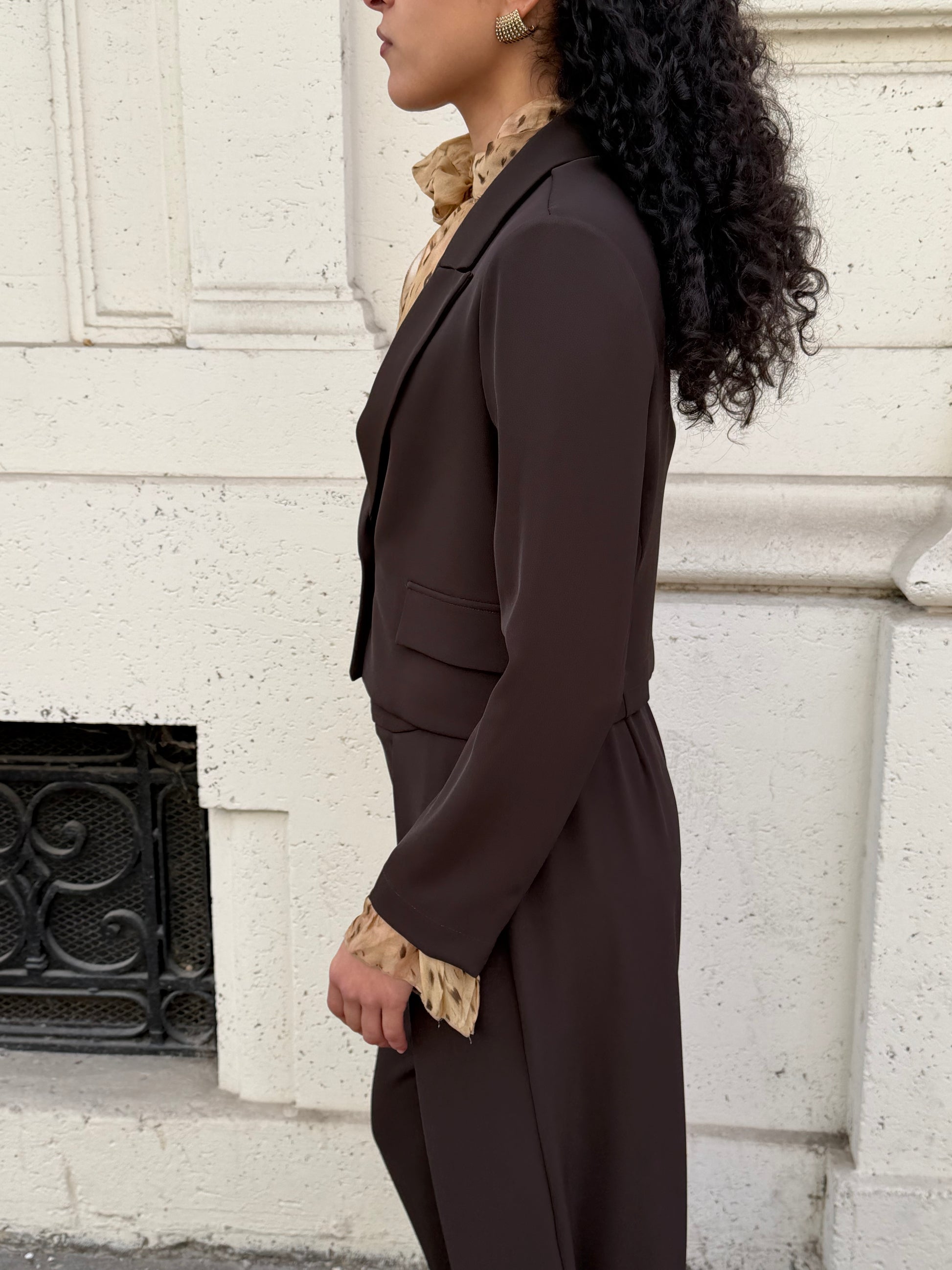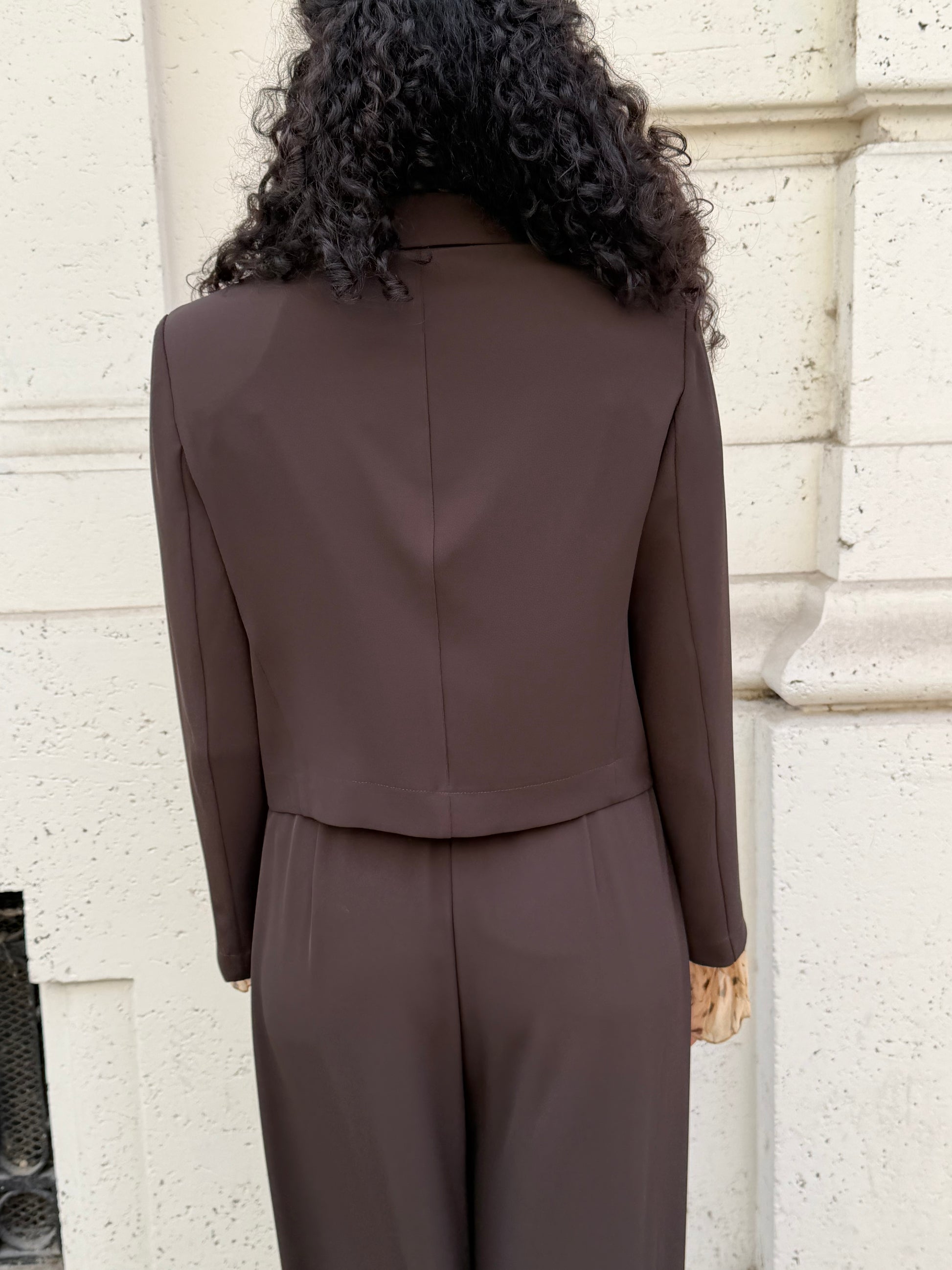 Giacca cropped color cacao, monopetto con bottone gioiello oro. Sfoderata all’interno e spalline strutturate.