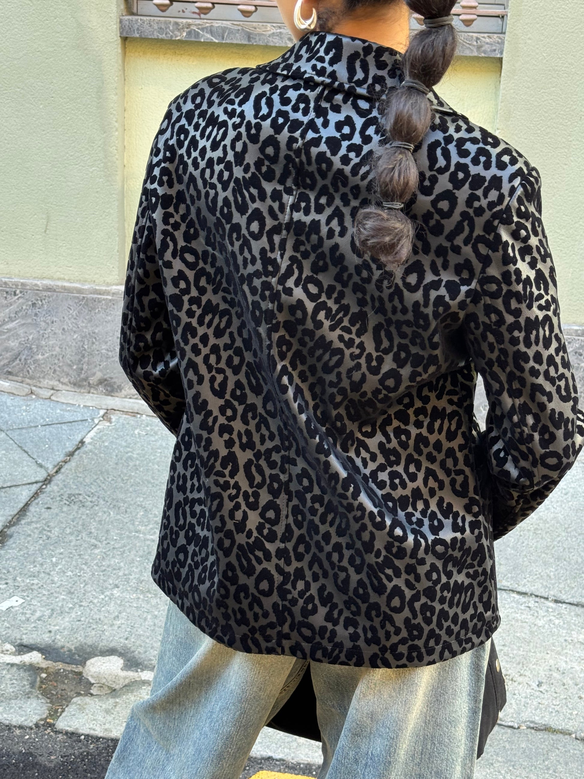 Giacca monopetto in ecopelle con lavorazione a stampa in velluto fantasia macula. Taglia unica (40-42-44)