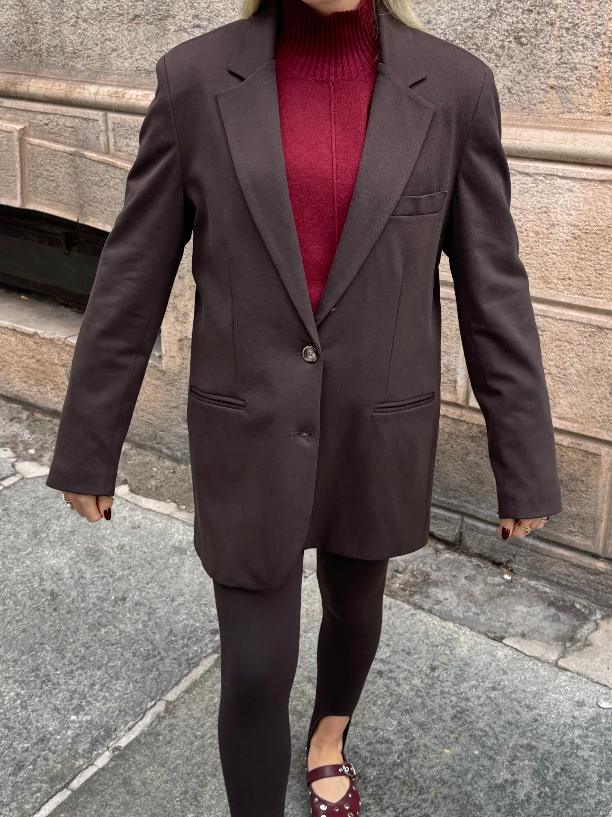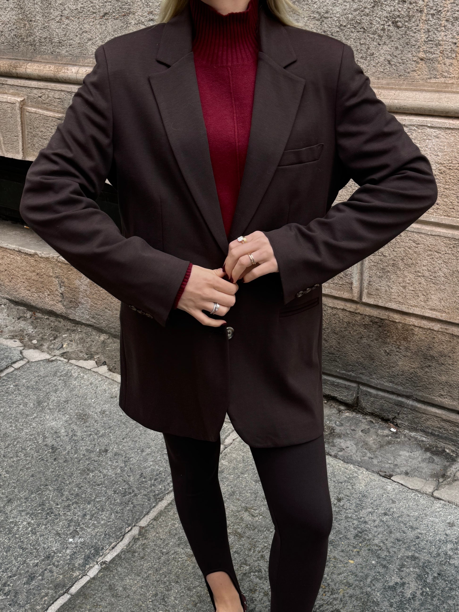 Giacca monopetto oversize color cioccolato, foderata all’interno. Stile uomo, in tessuto punto milano elasticizzato.