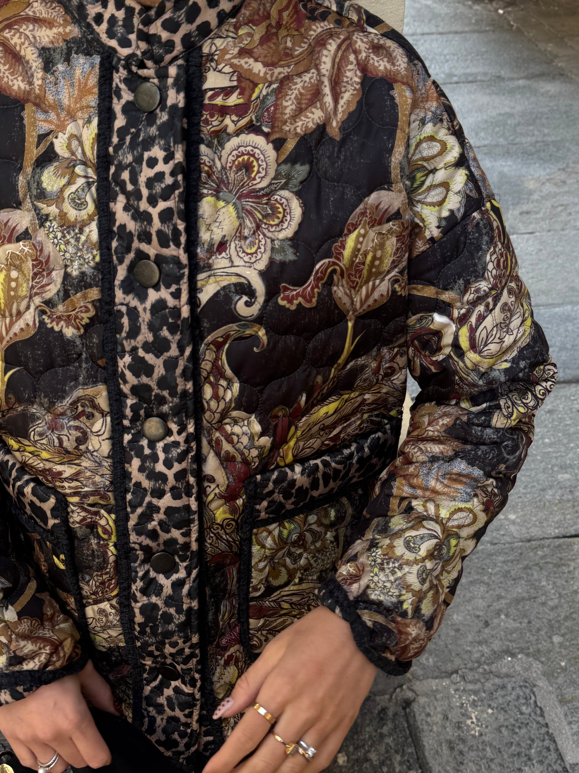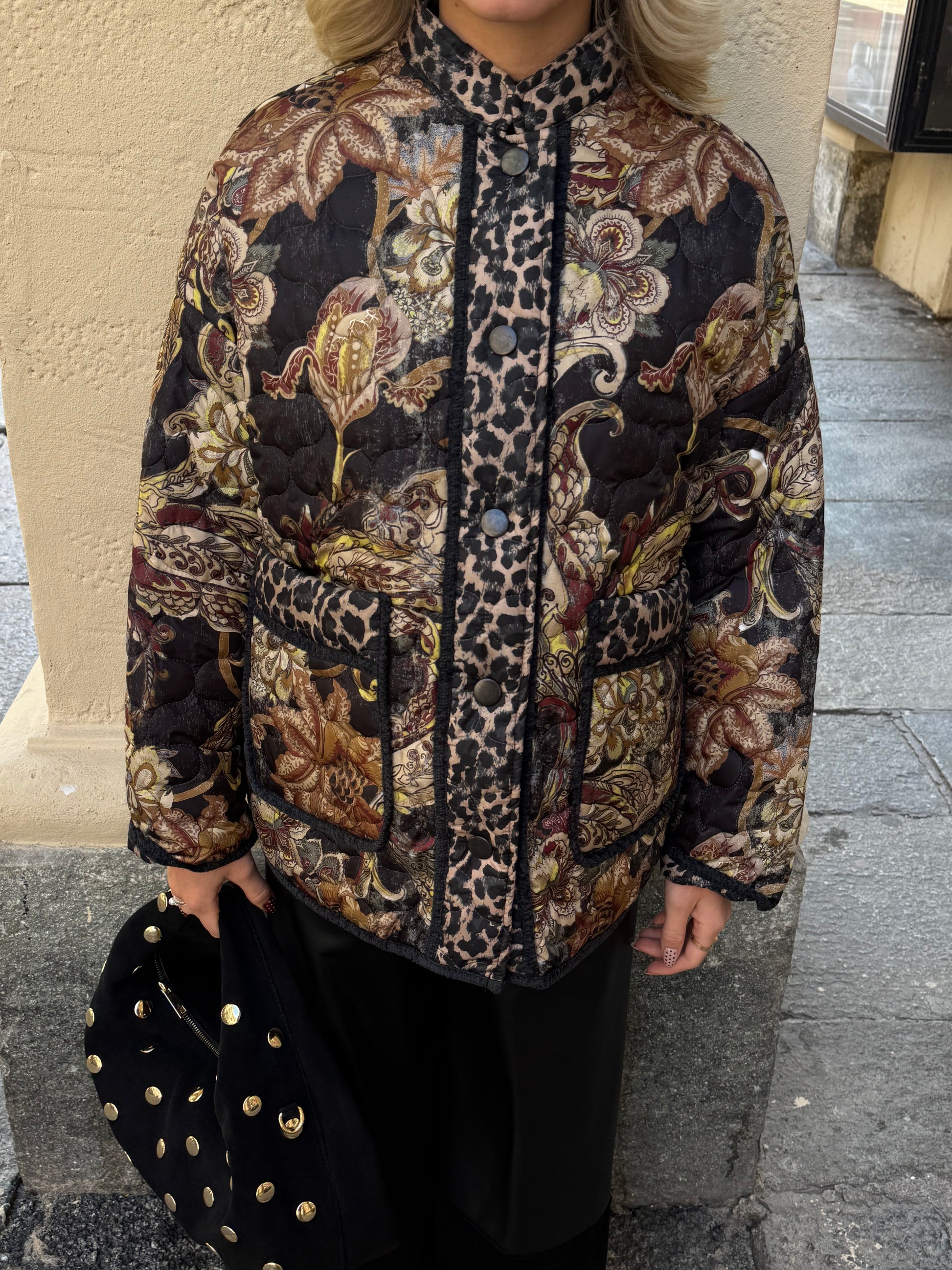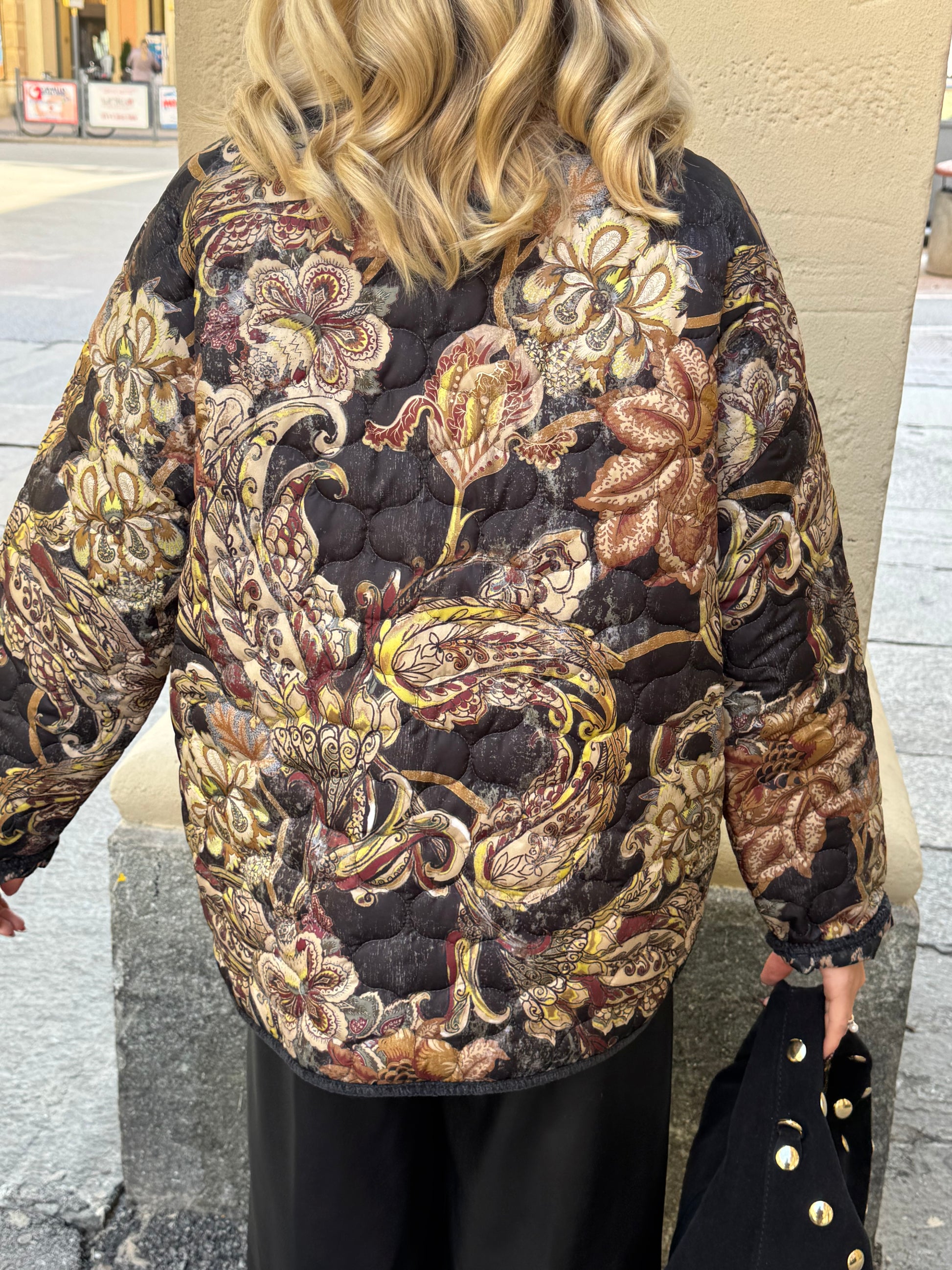 Giacca modello a scatola trapuntato in fantasia base nera con disegni oro e bronzo. Rifiniture in velluto, chiusura a bottoni automatici e collo alla coreana.