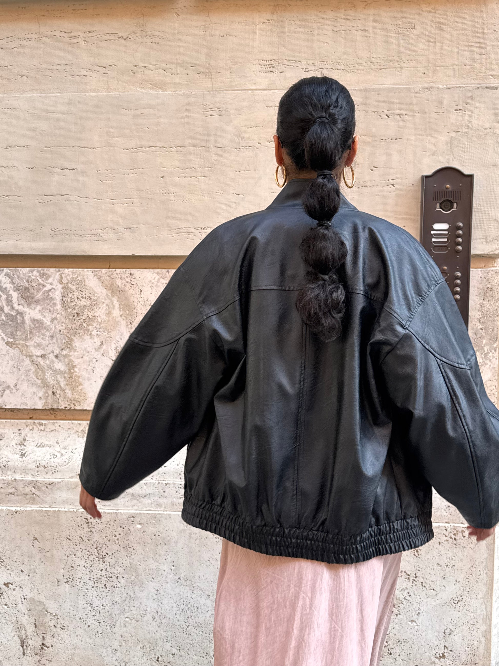 Giubbotto in ecopelle color nero modello a bomber. Chiusura con cerniera e patta sovrapposta fino al collo, foderato all’interno, tasche laterali.