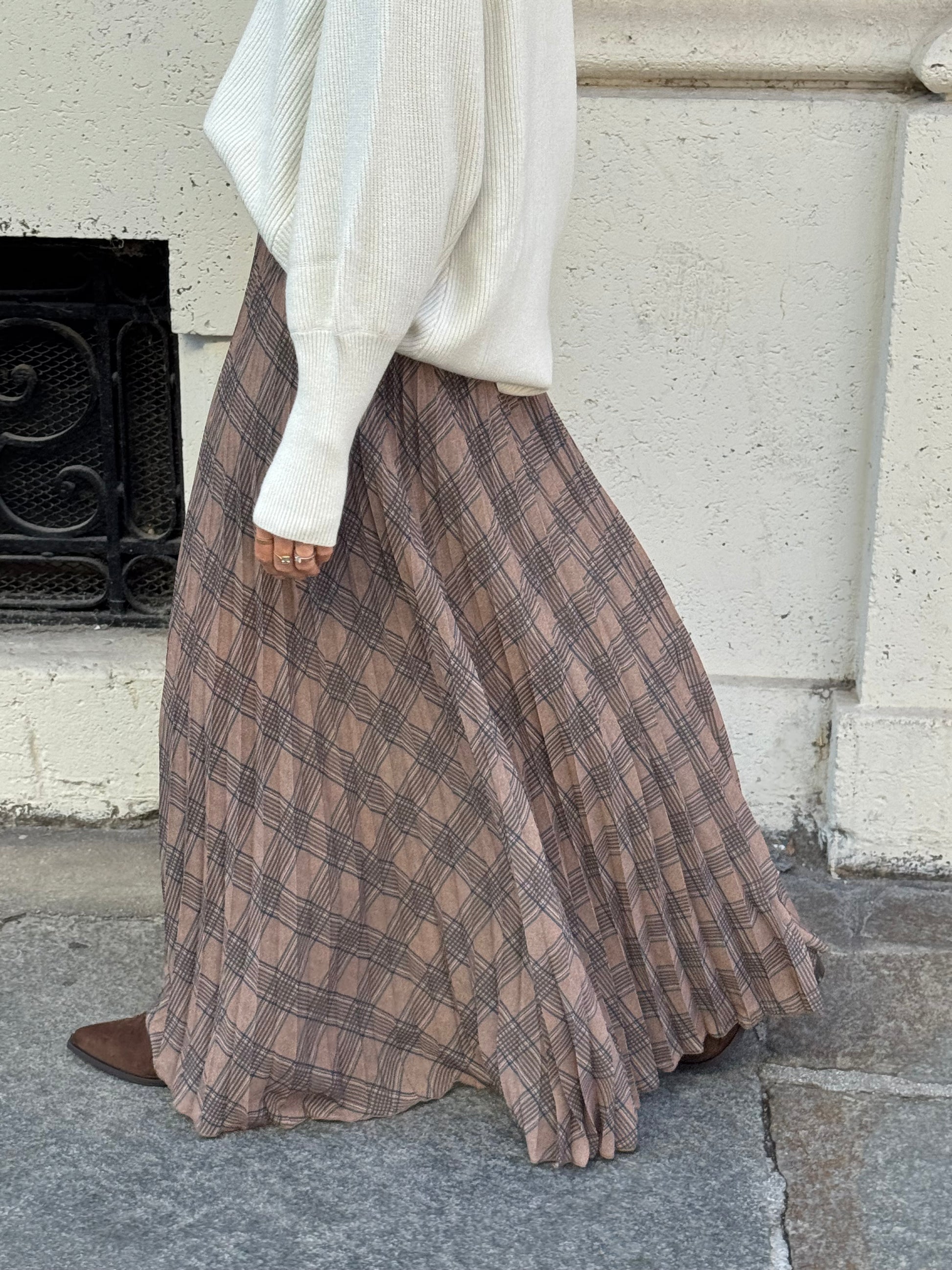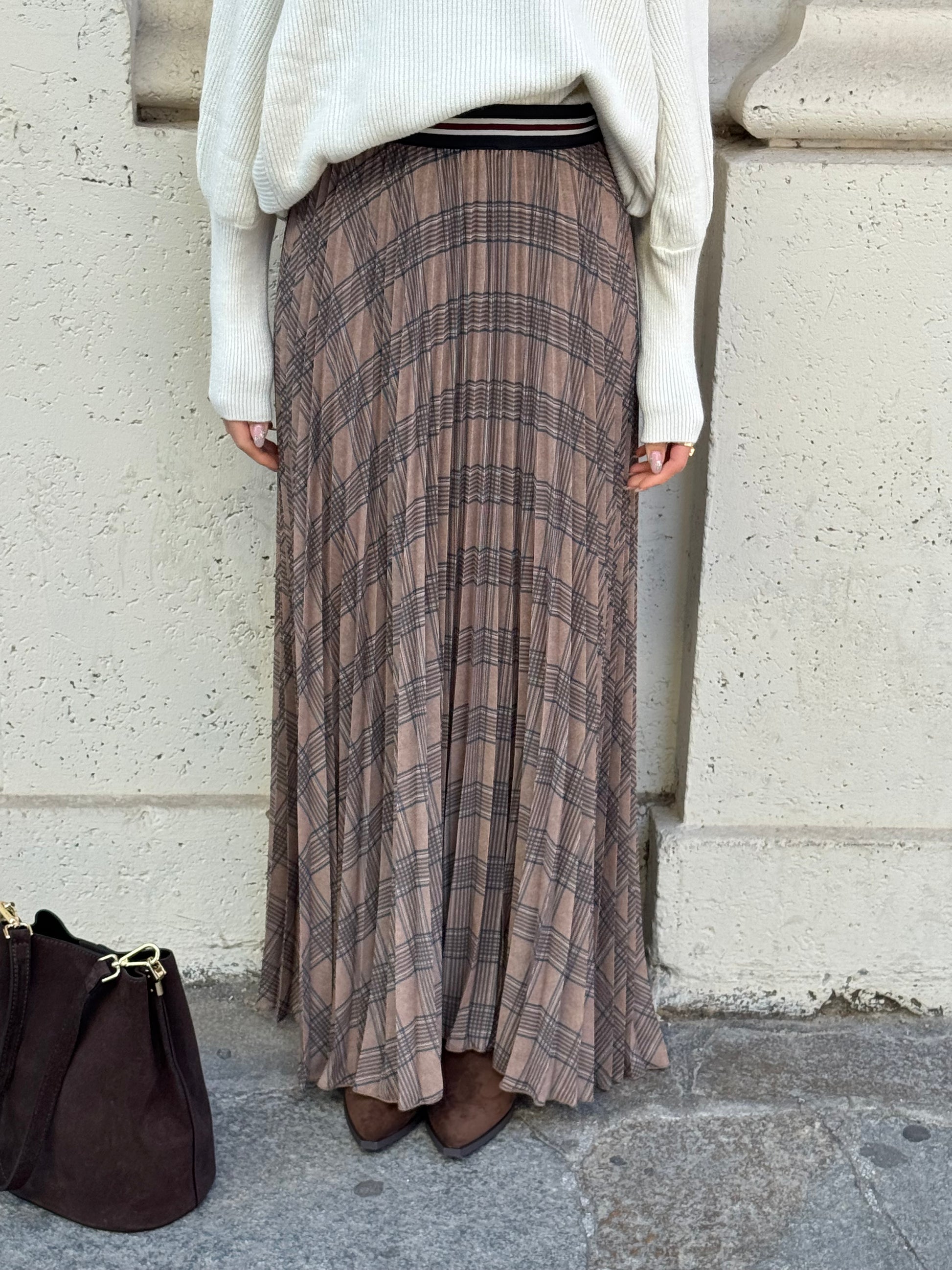 Gonna lunga foderata con elastico in vita e fantasia check nei toni del beige e nero.