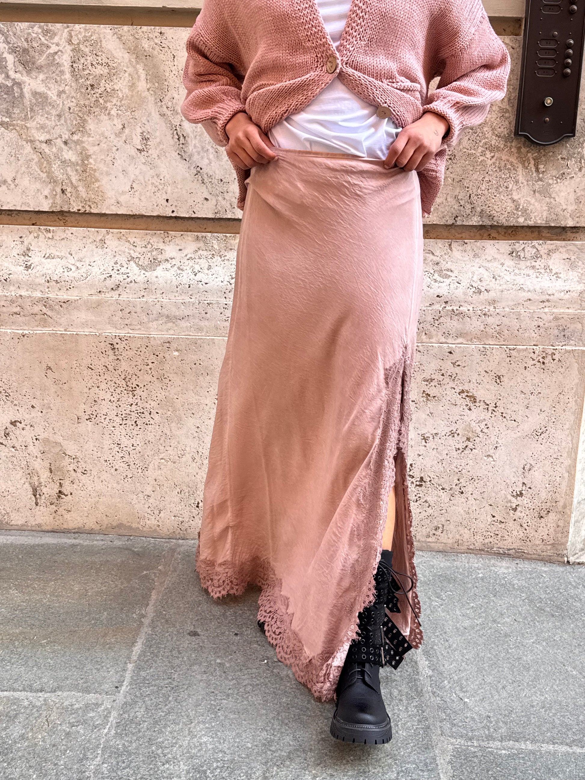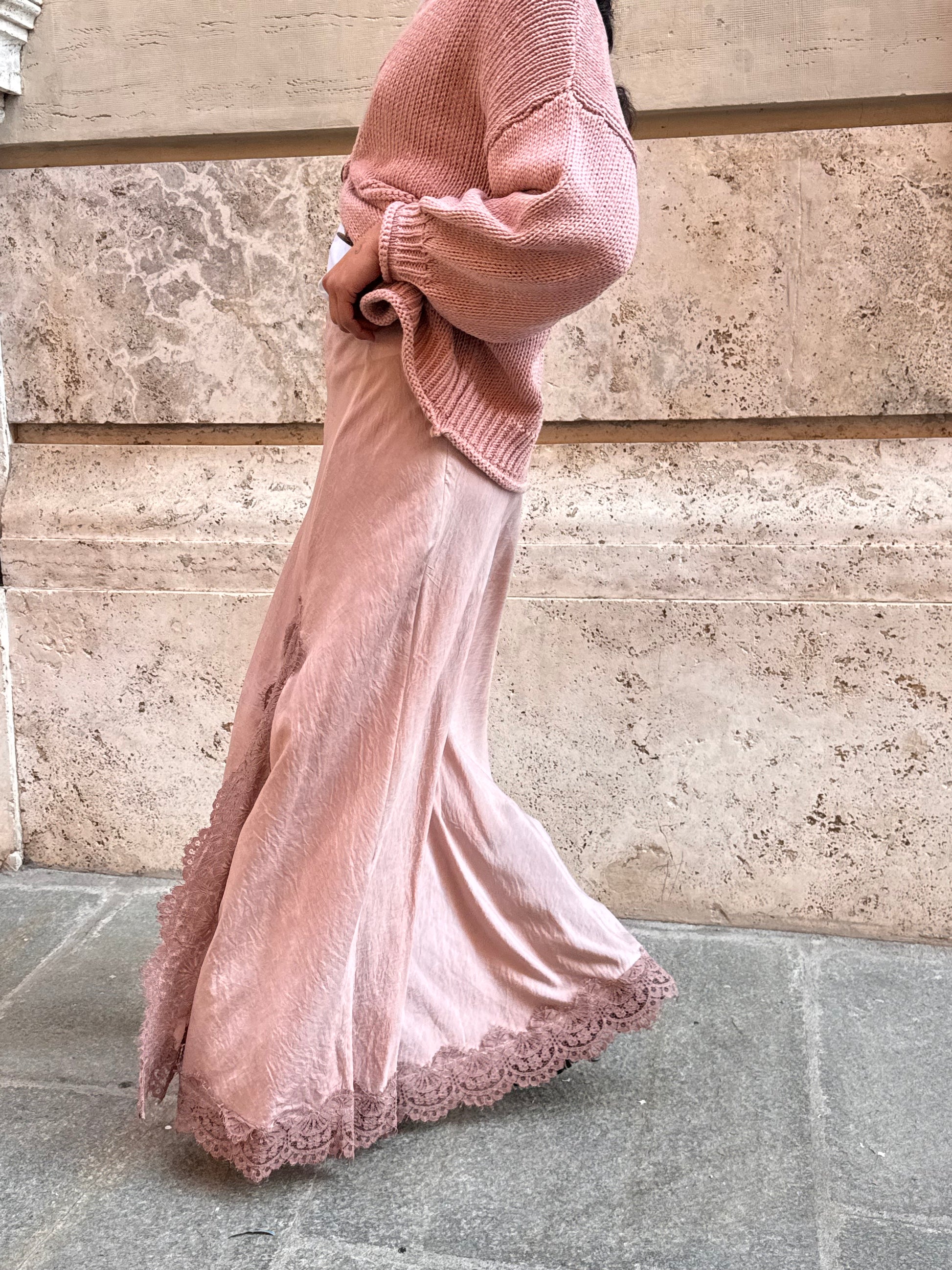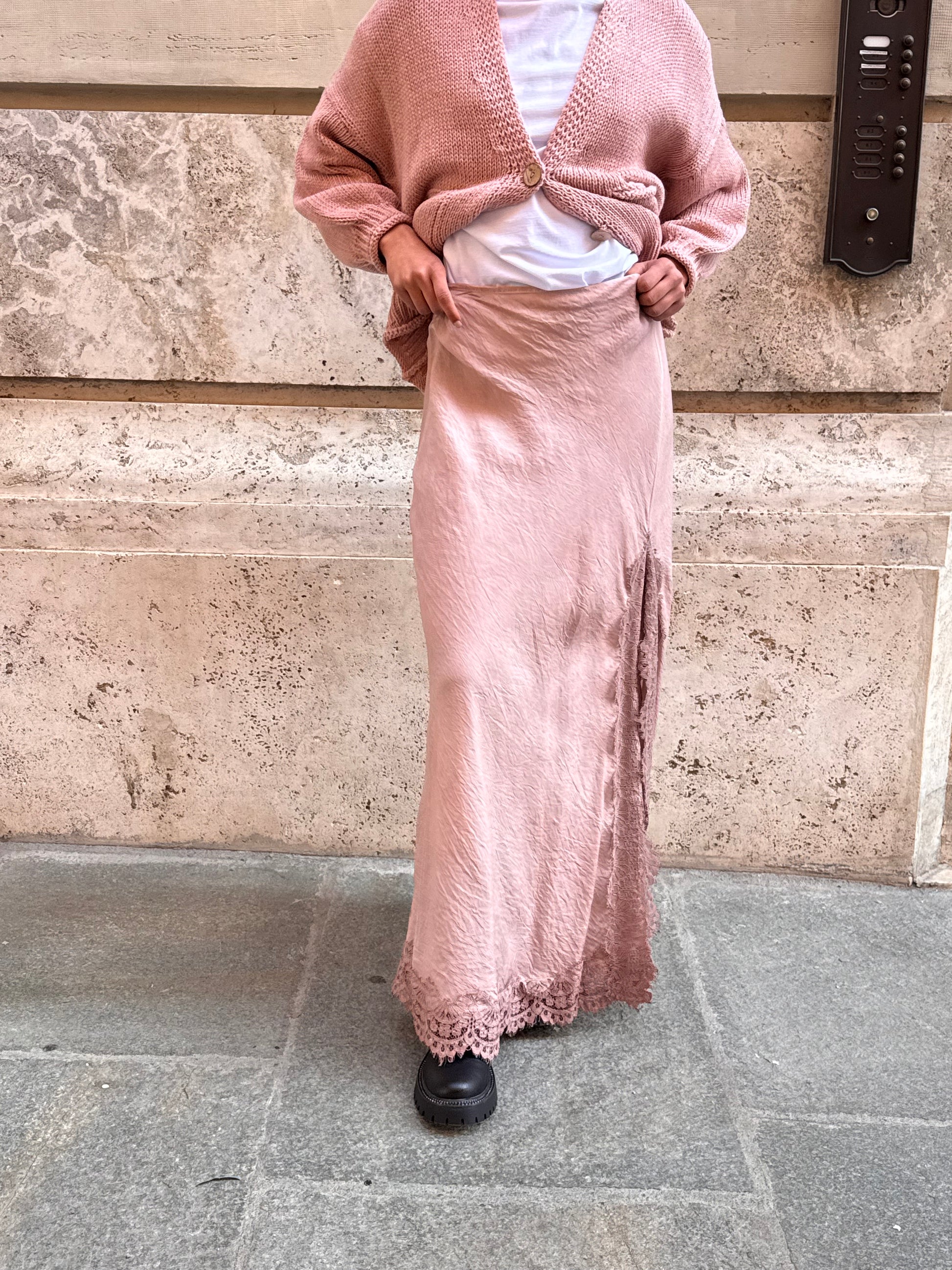 Gonna lunga in tessuto tinto in capo, color rosa. Spacco alto rifinito da pizzo tono su tono. Cerniera laterale.
