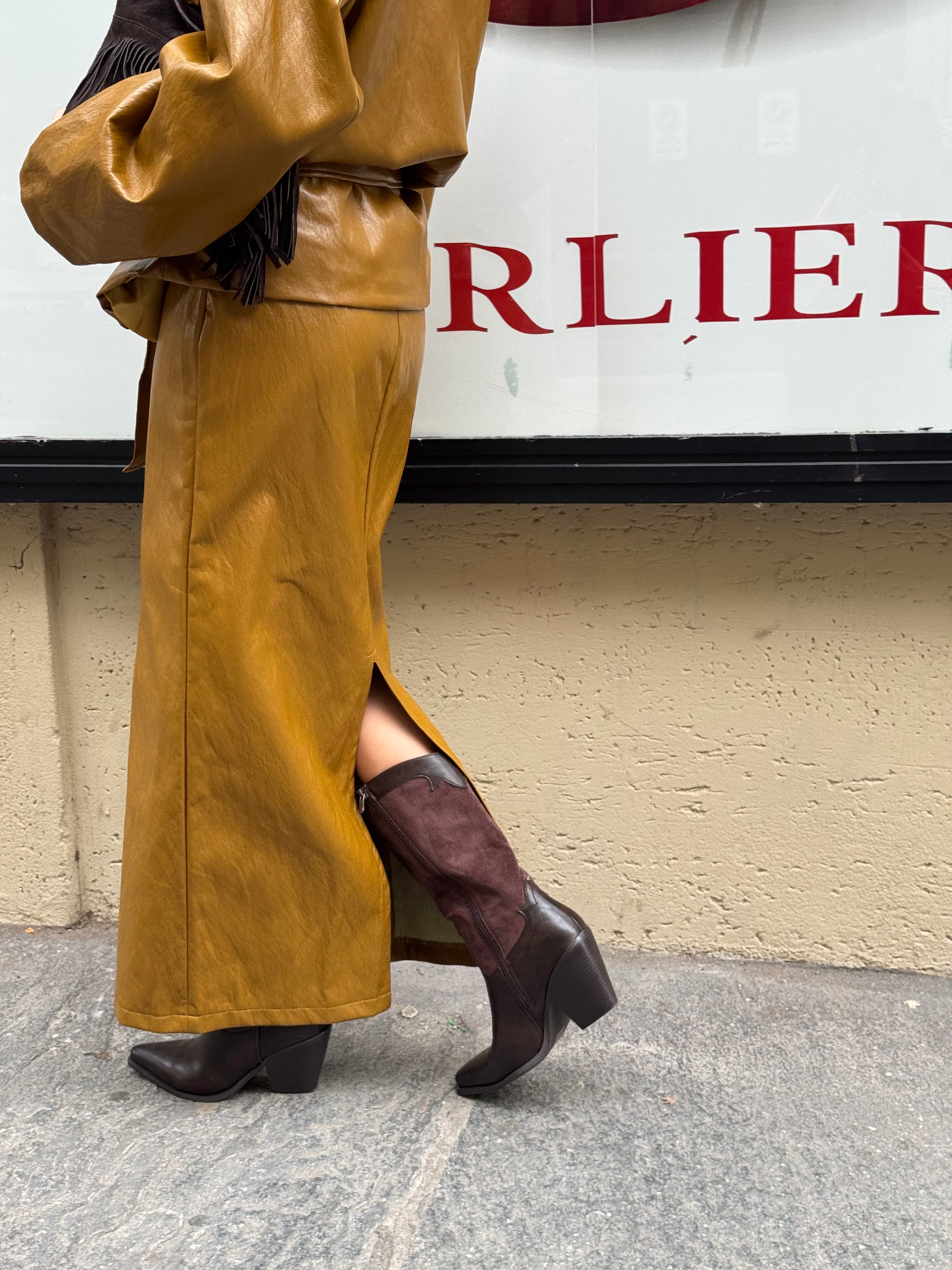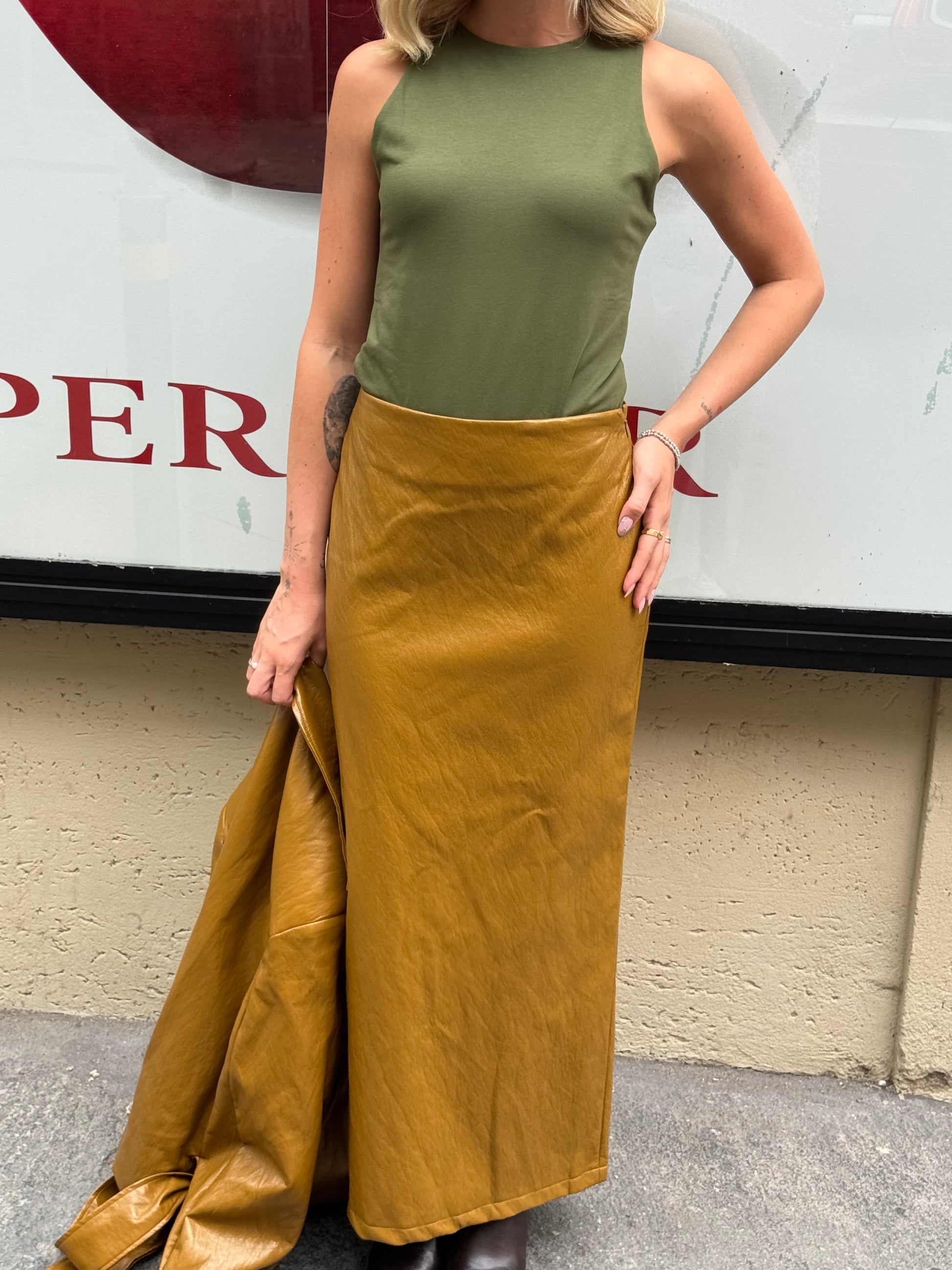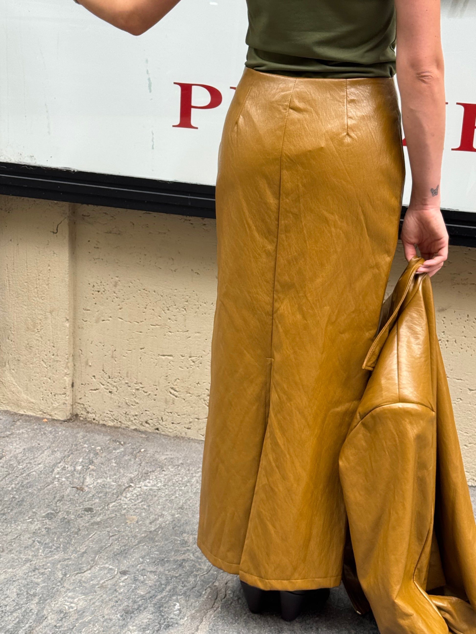 Gonna in ecopelle lucida color senape, forma a matita. Spacco posteriore, zip laterale.