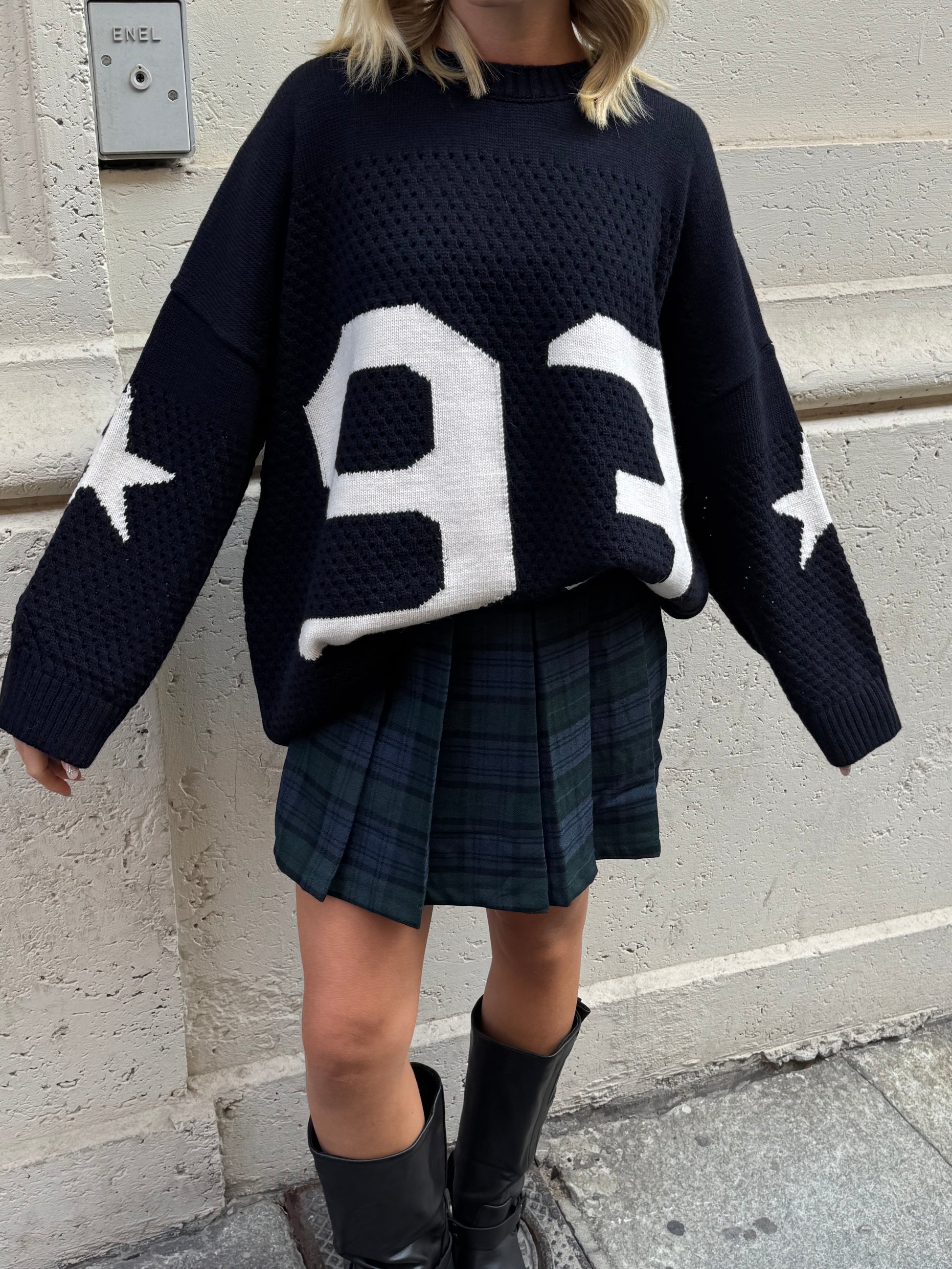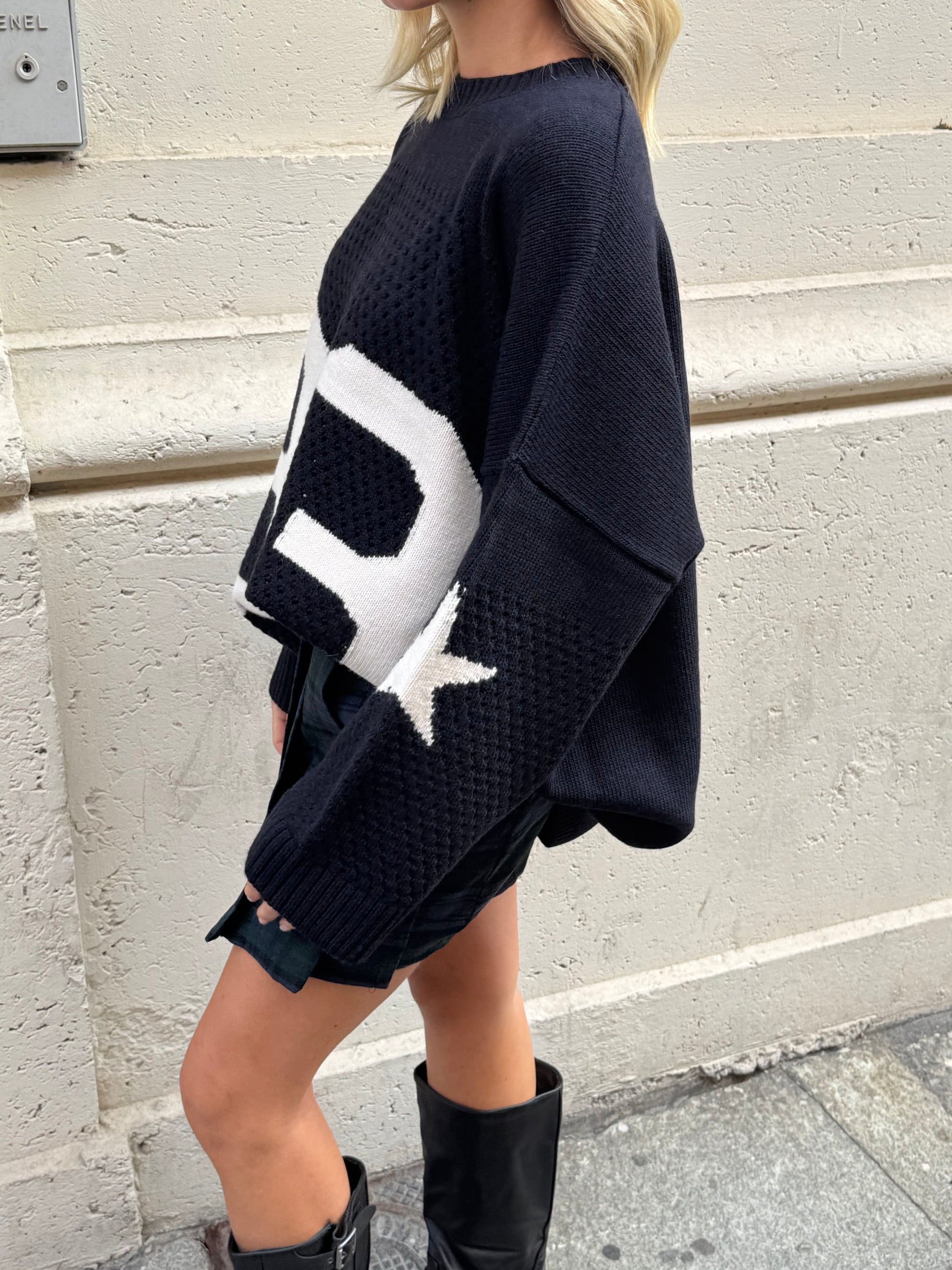 Maglia oversize color blu notte con numero 93 e stelle a contrasto. Lavorazione a punto traforato, polsini e bordo a coste.