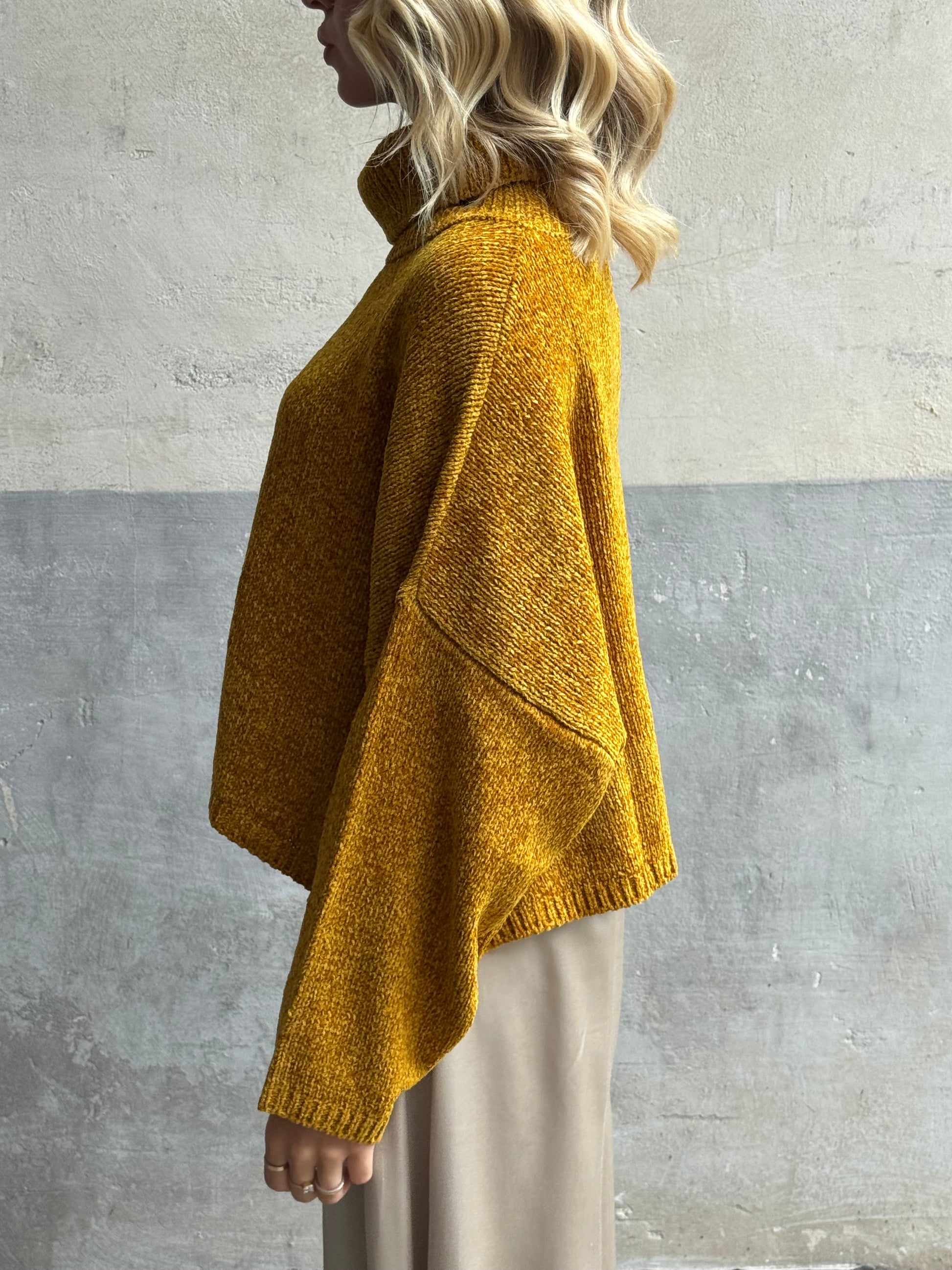 Maglia in ciniglia modello a scatola con collo a cratere. Color senape.