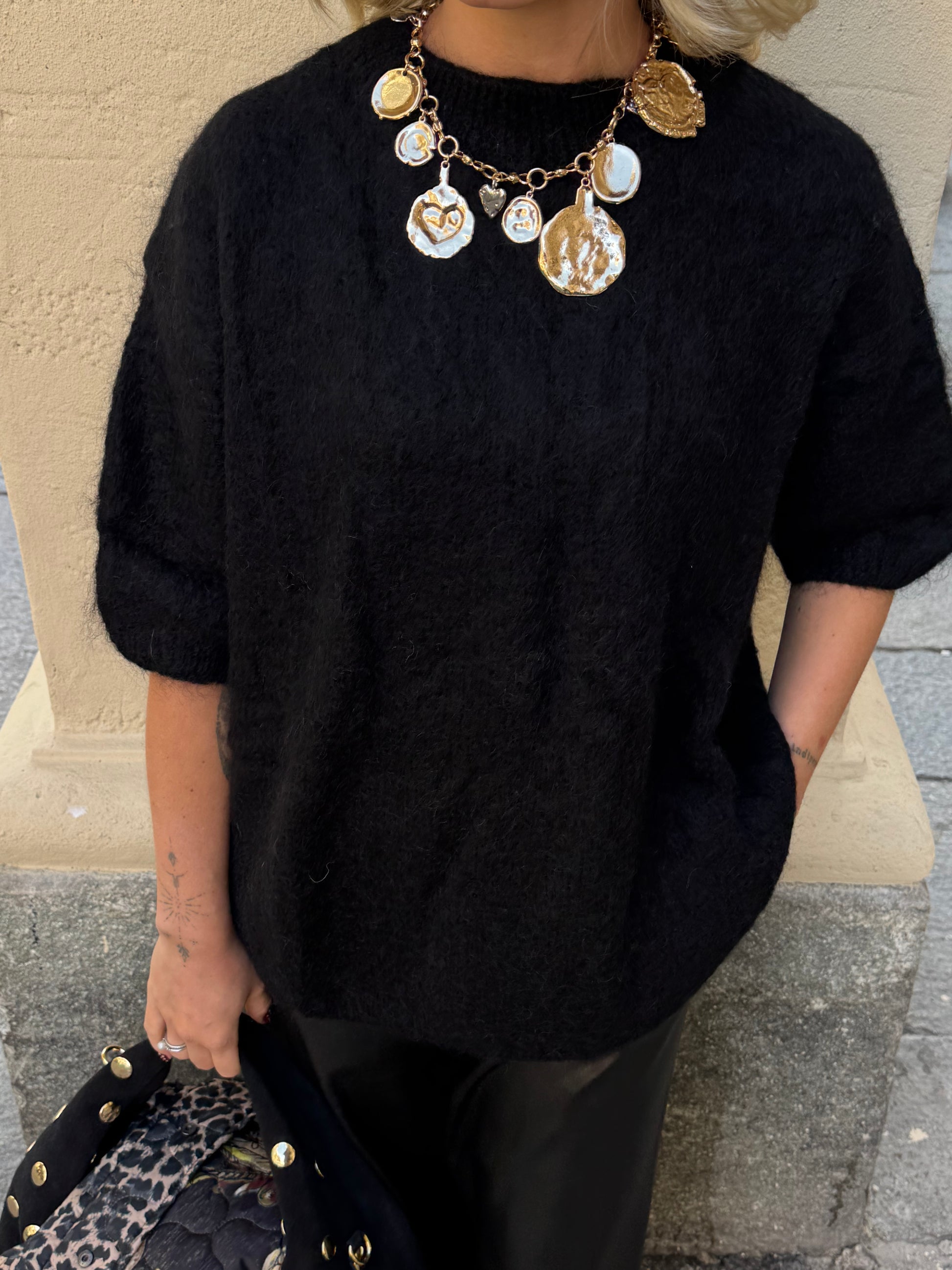 Maglia effetto nuvola color nero, girocollo e maniche a gomito.