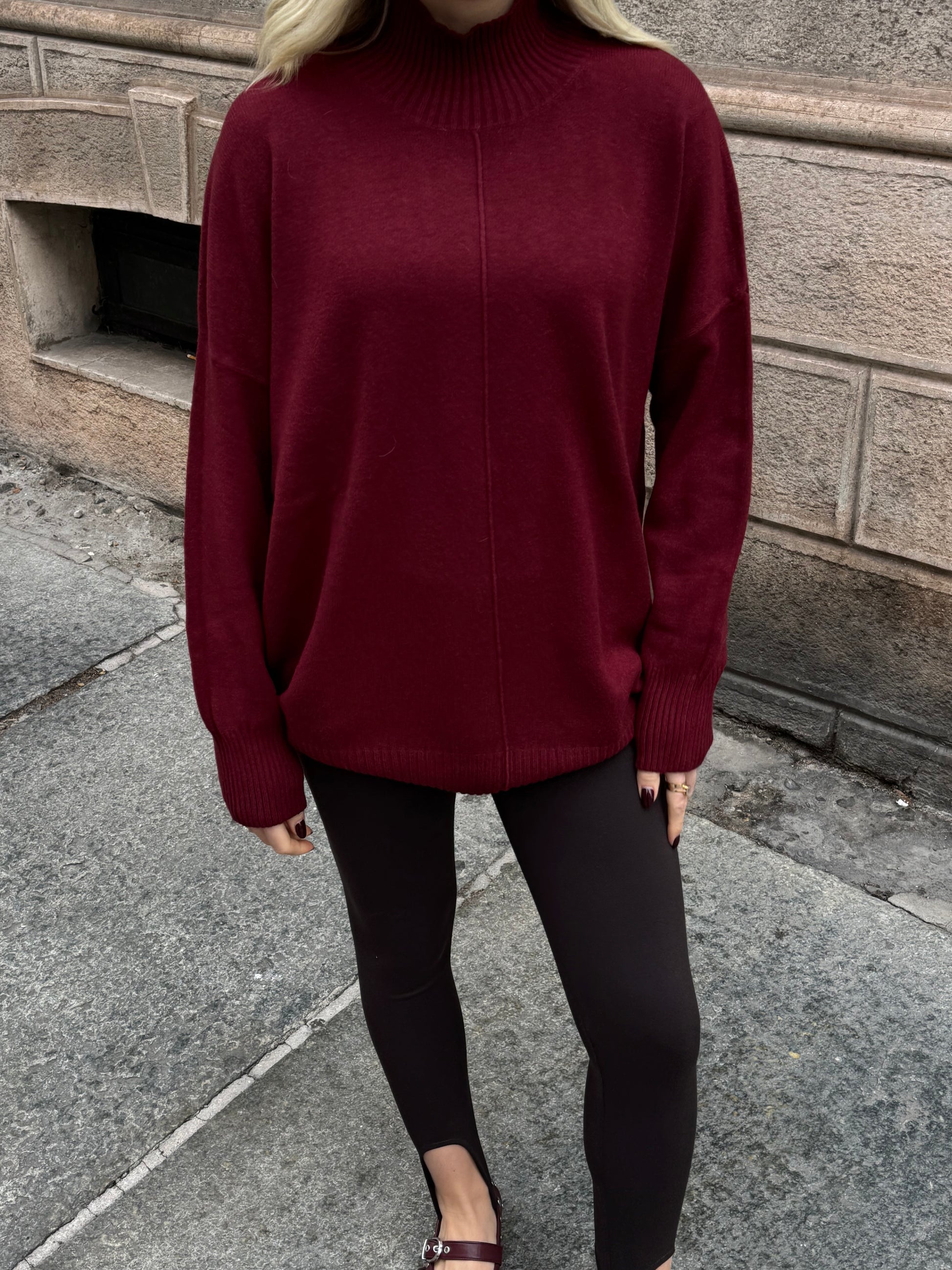 Maglia oversize con collo alto a coste, manica lunga con polsini alti a coste strette. Color Bordeaux.