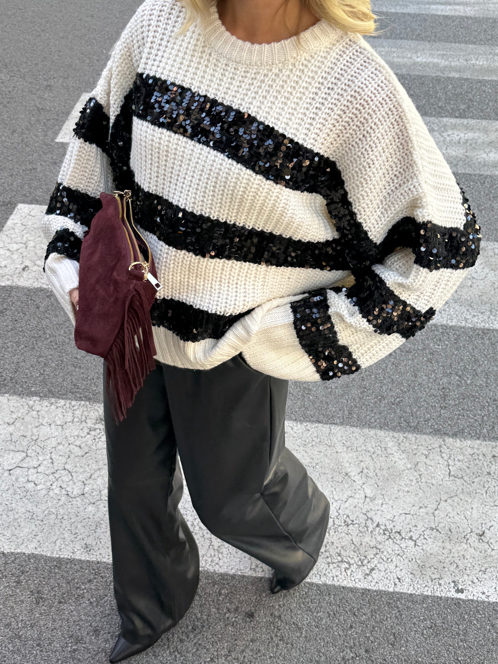 Maglione a scatola girocollo, rigato con lavorazione a coste larghe e strisce di paillettes nere.