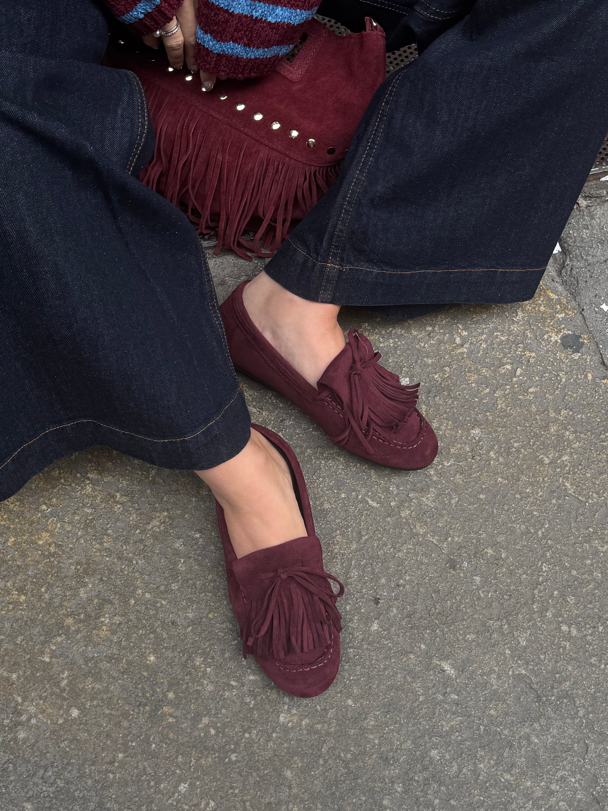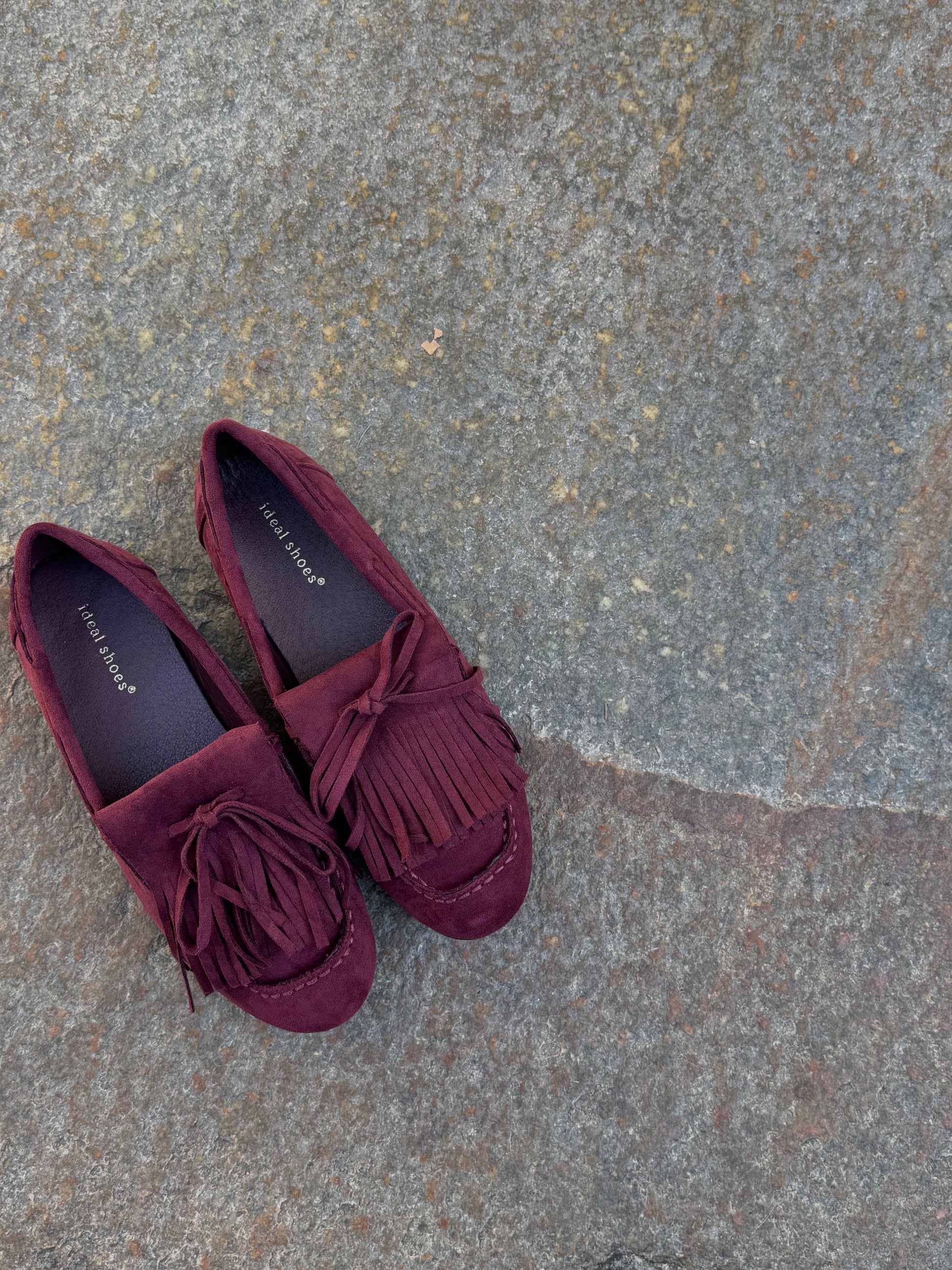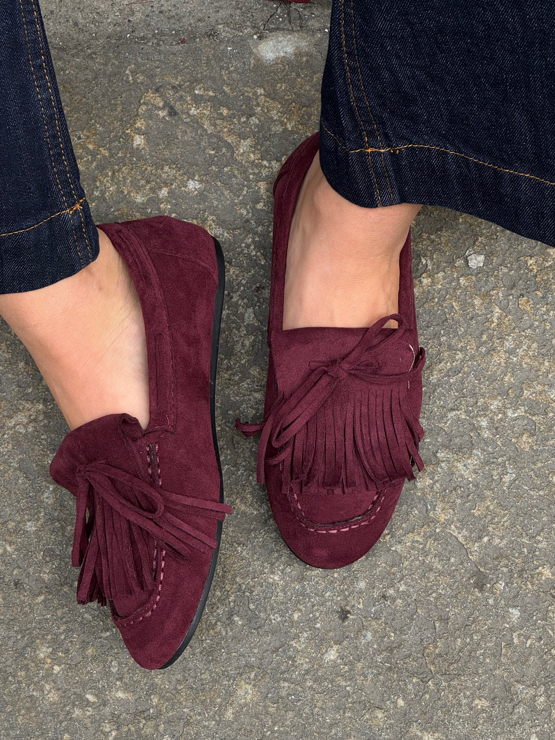Mocassino in ecopelle effetto suede. Color Barolo, dettaglio frange e fiocco.