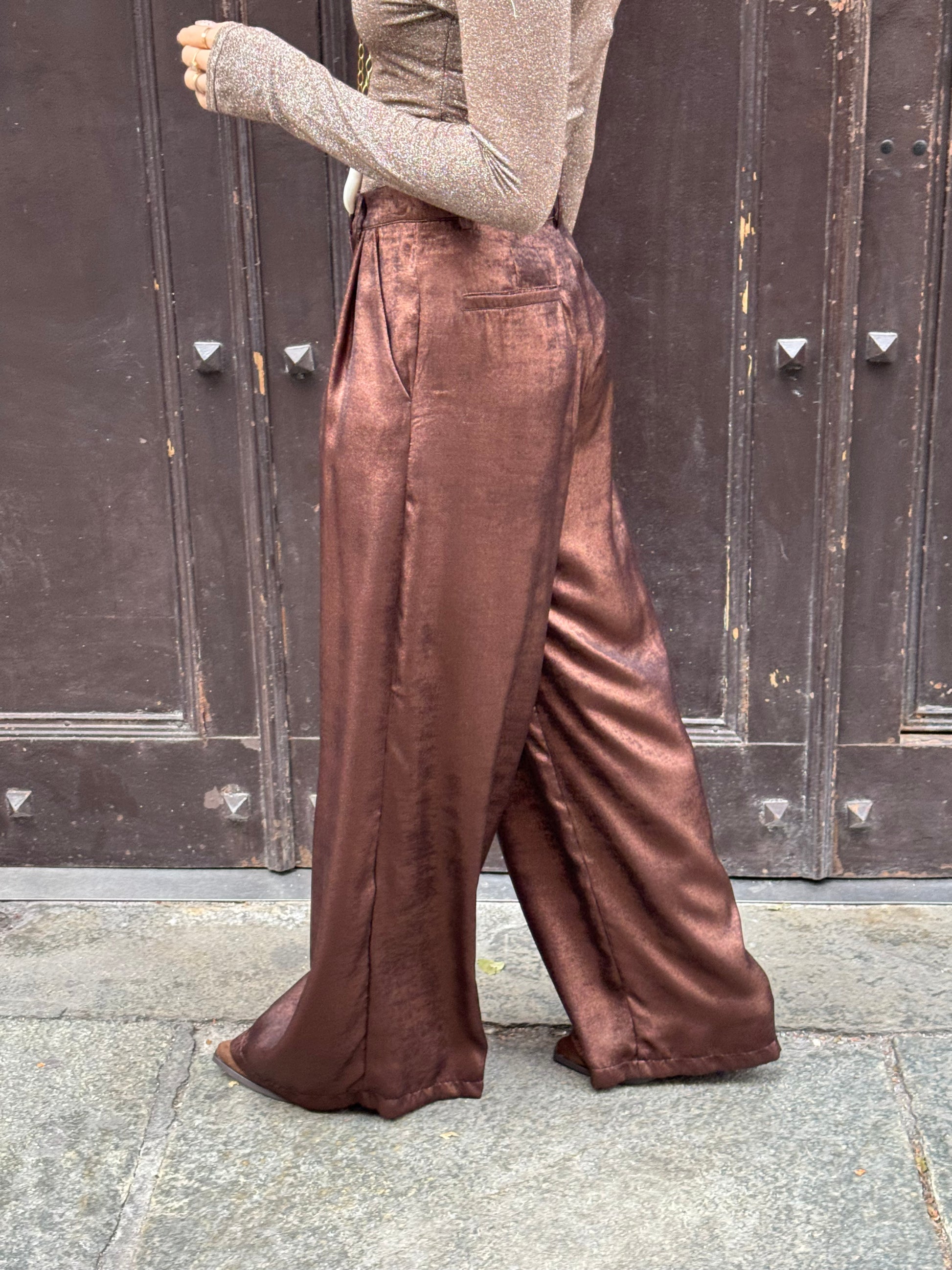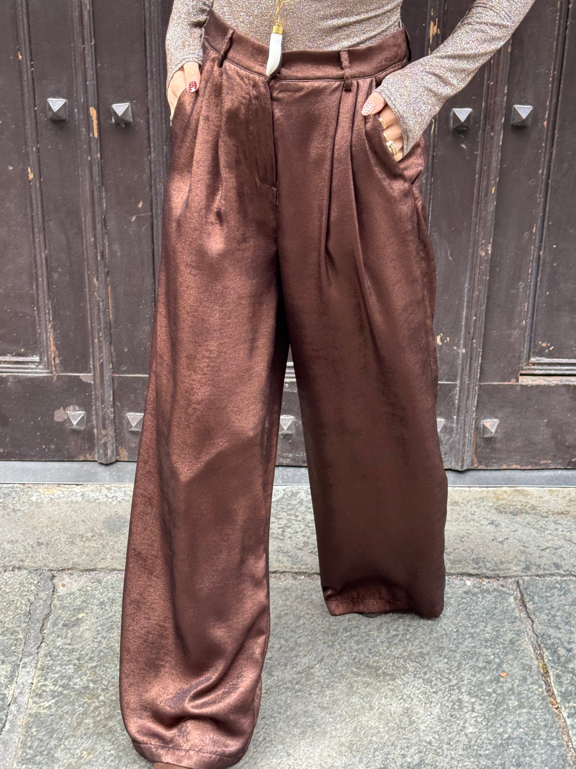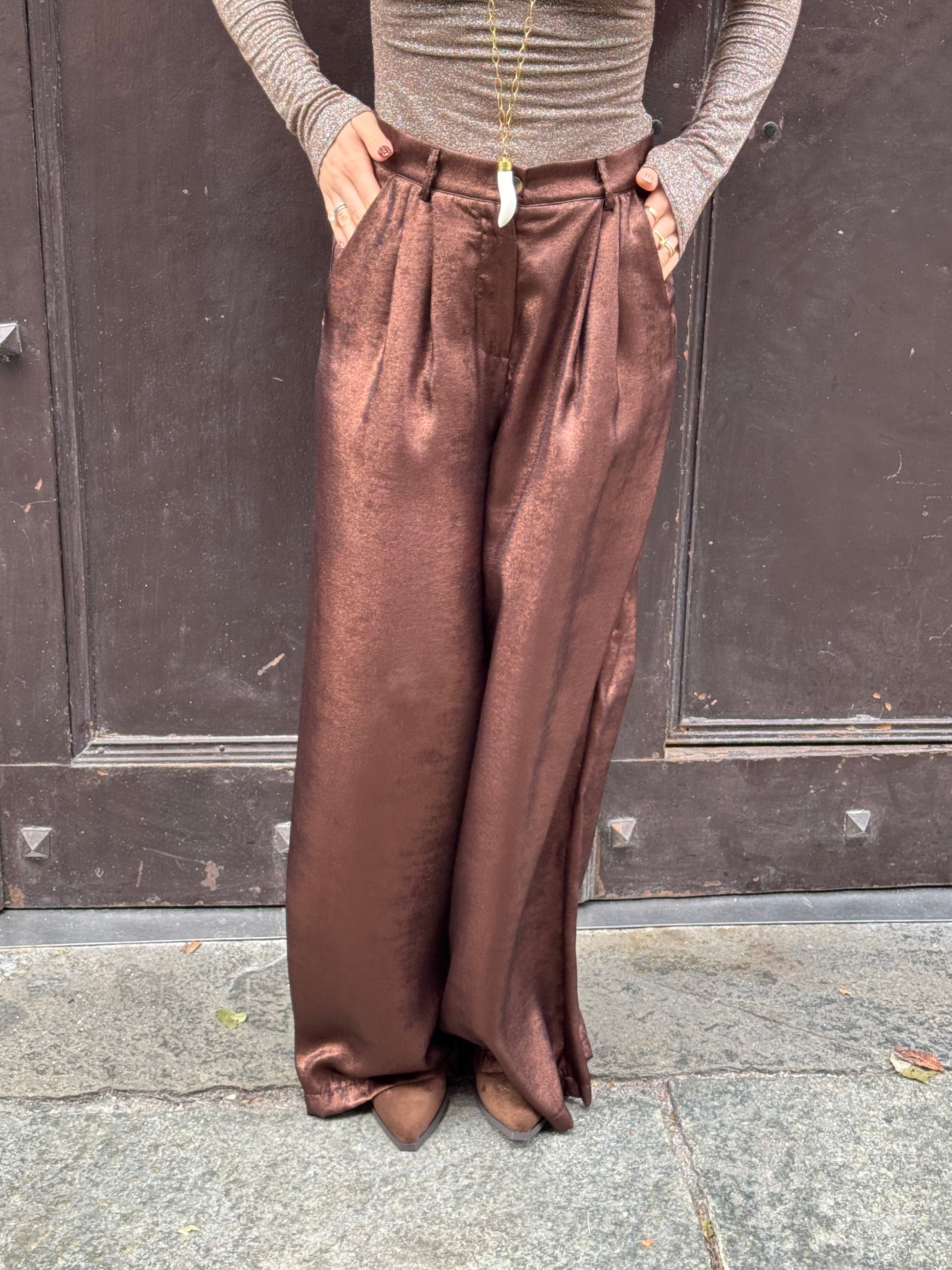 Pantalone color bronzo a palazzo con pinces e tasche laterali. Tessuto laminato.