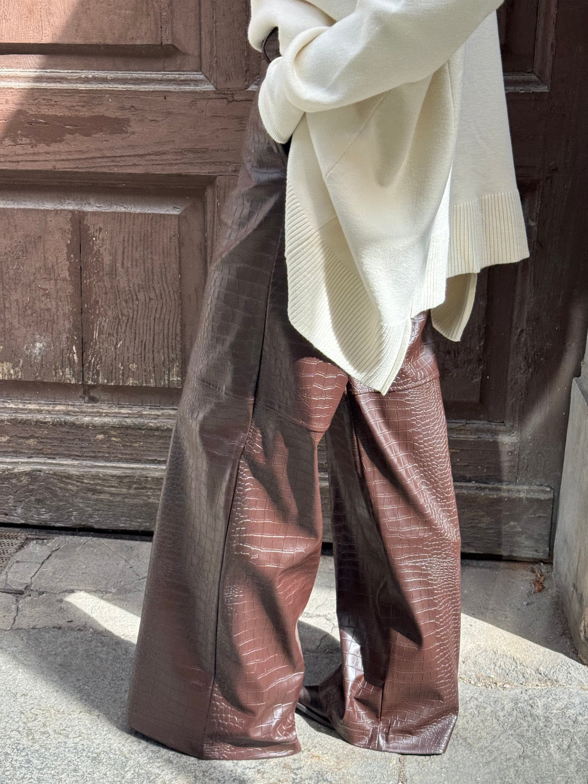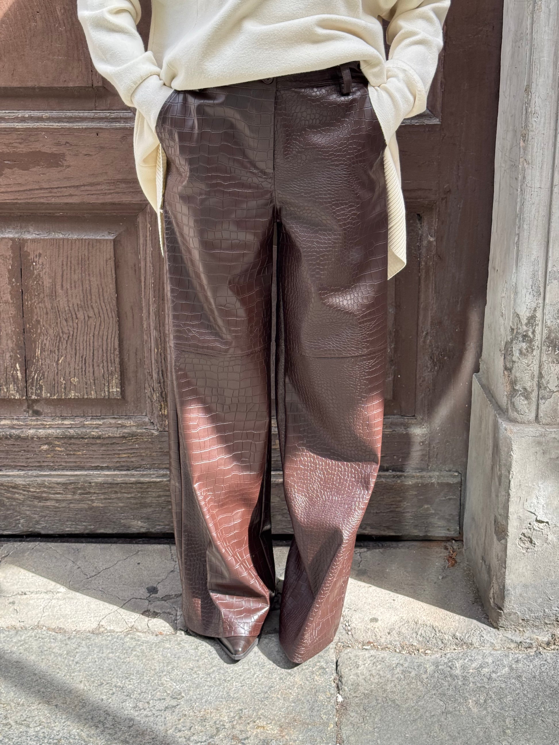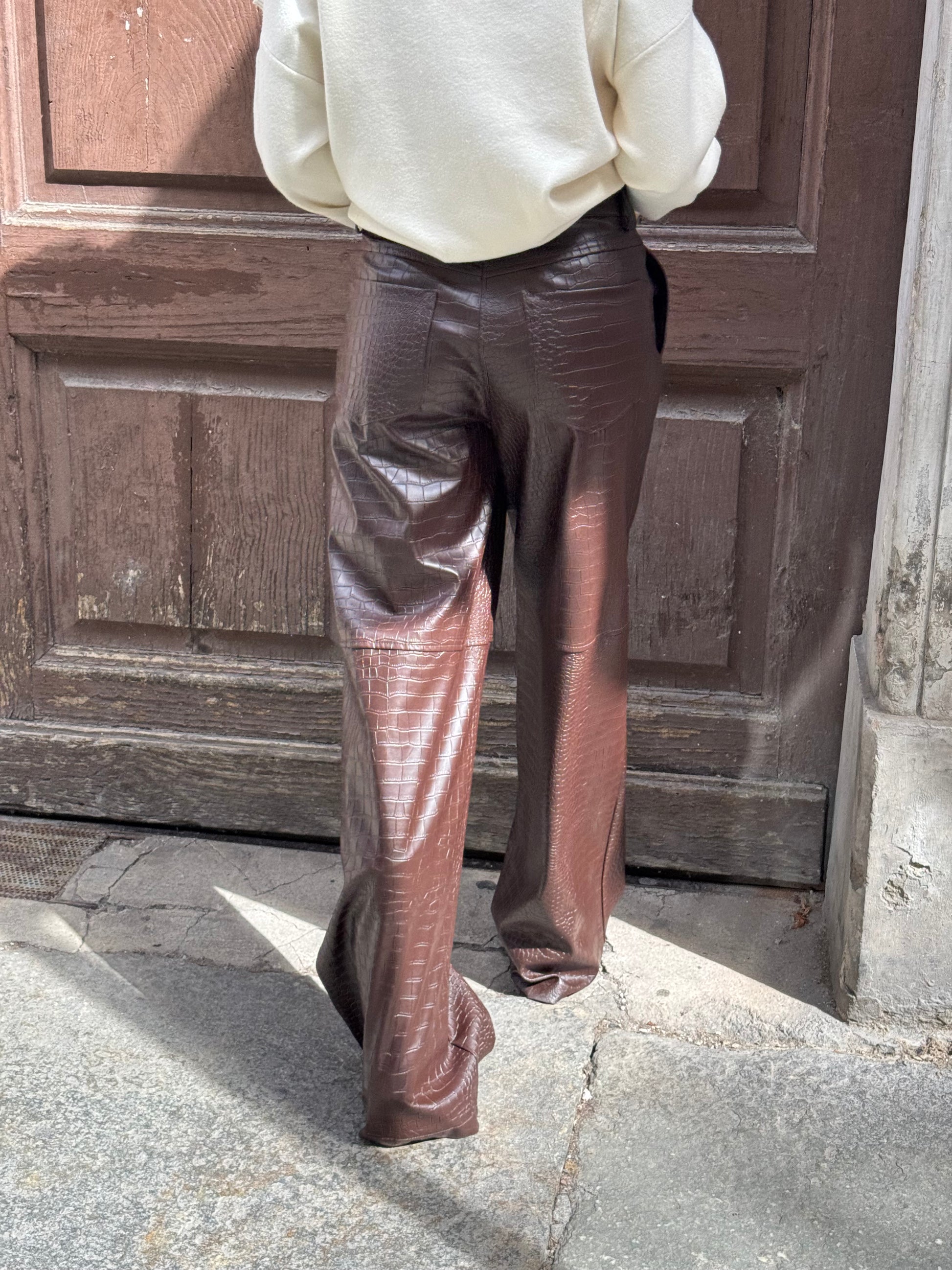 Pantalone in ecopelle stampa coccodrillo, color cioccolato. Vita alta, quattro tasche.