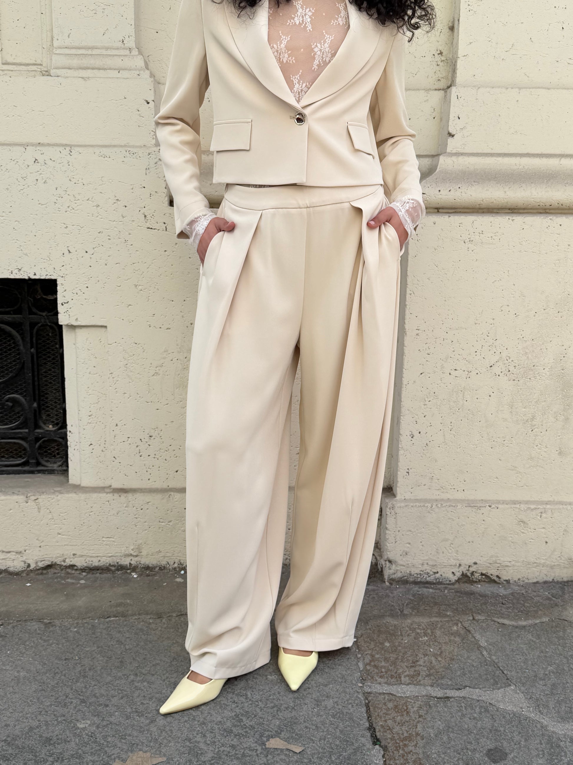 Pantalone a palazzo con pinces sul davanti, tasche a filo ed elastico i vita nella parte posteriore. La gamba è ampia leggermente chiusa sul fondo.