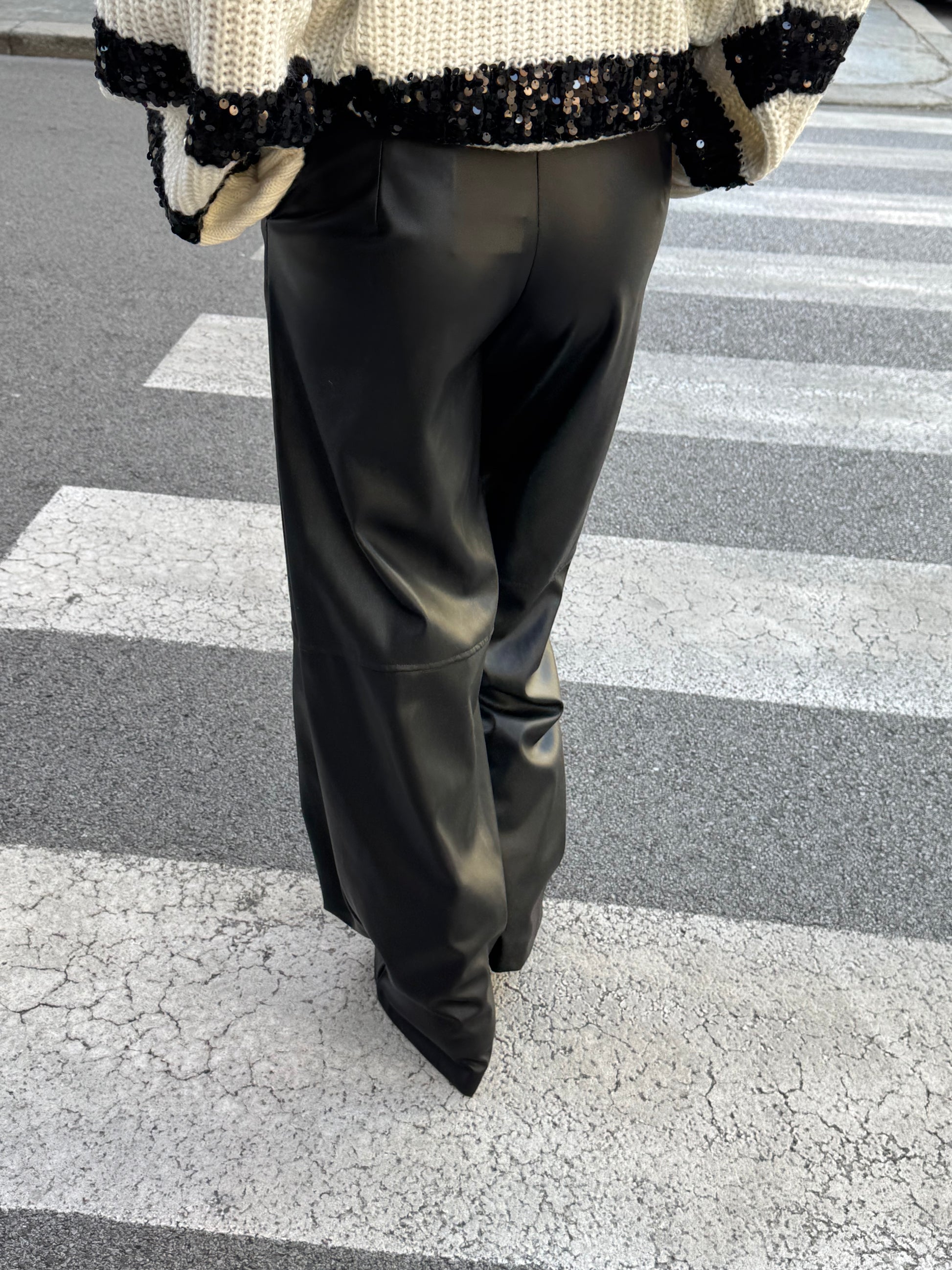 Pantalone a palazzo in ecopelle color nero. Tasche laterali e chiusura a cerniera con bottone automatico.